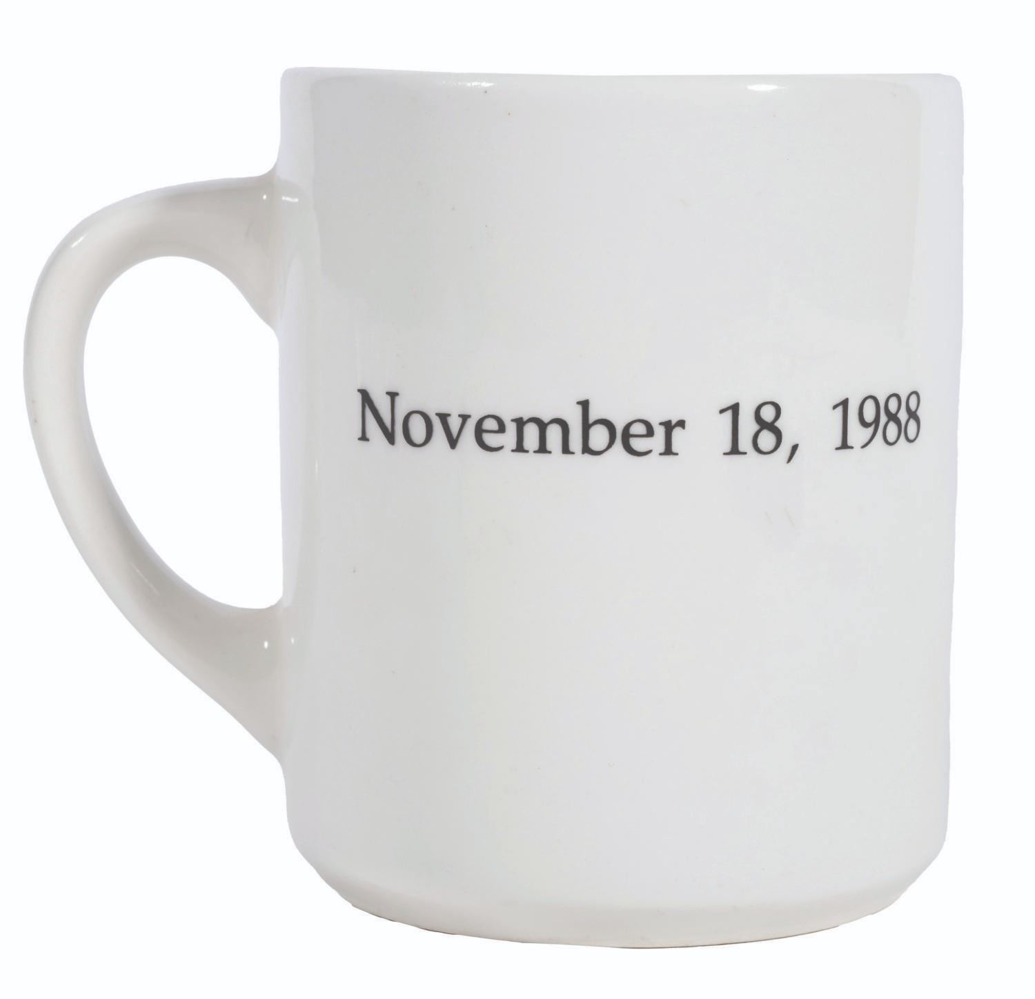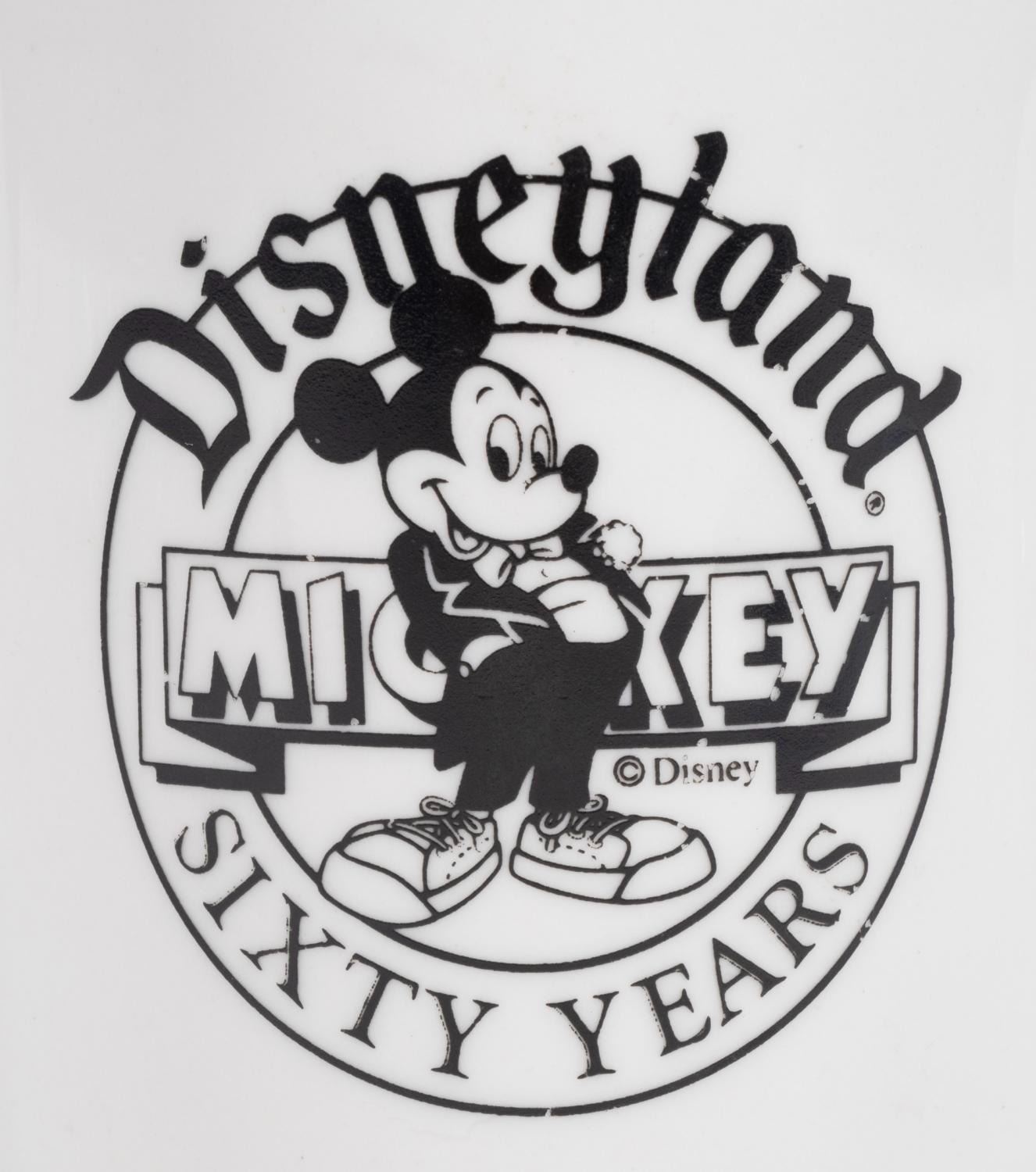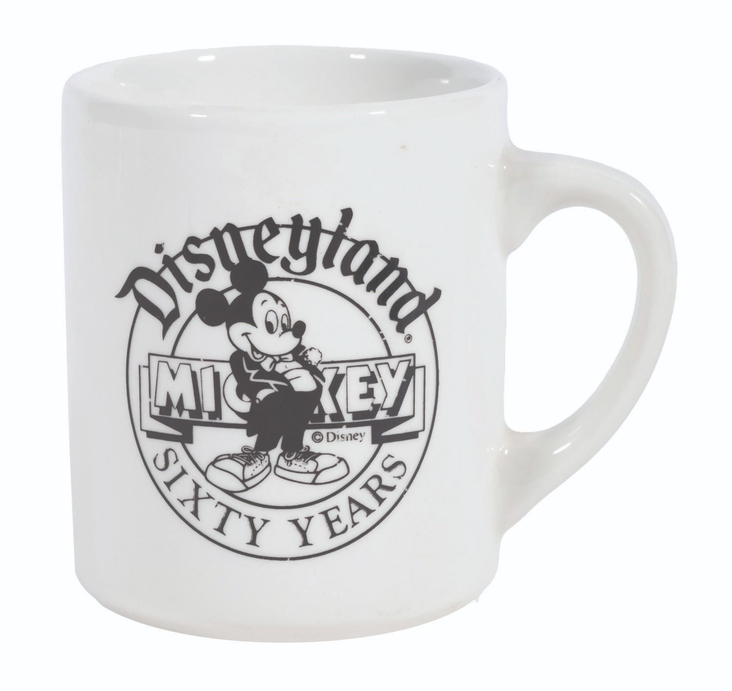 (Disneyland, 1988) A souvenir coffee mug celebrating Mickey's 60th birthday. Printed on one side is November 18, 1988, the exact date of Mickey's 60th. Measuring 3.75" tall and 3" in diameter, the mug is in very good condition with some surface wear to the logo.