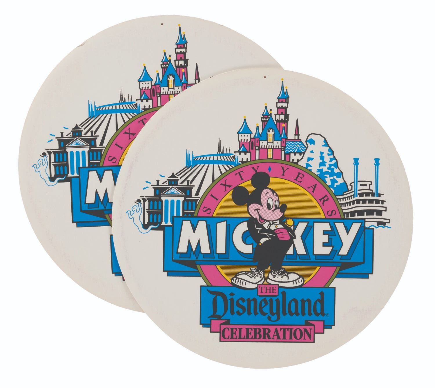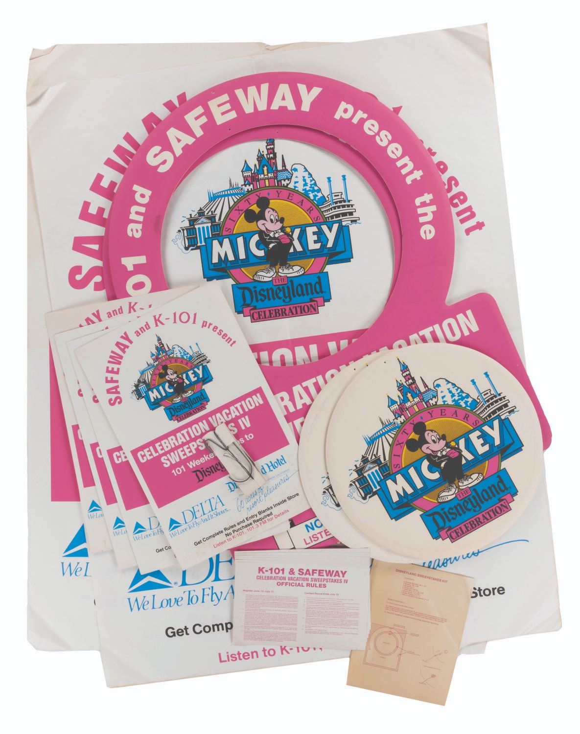 (Disneyland, 1988) A Sixty Years of Mickey Celebration Vacation Sweepstakes IV display. Presented by K-101, Safeway, and Delta, the sweepstakes awarded 101 weekend trips to Disneyland. Included in the display kit are four small posters, two large posters, two large display rings, two round Sixty Years of Mickey signs, six official rules cards, assembly instructions, and two hooks for display. Measuring from the 7” x 11” rules cards to the 38” x 50” posters, the display is in good condition with creases, stains, discoloration from age, and wear from use.