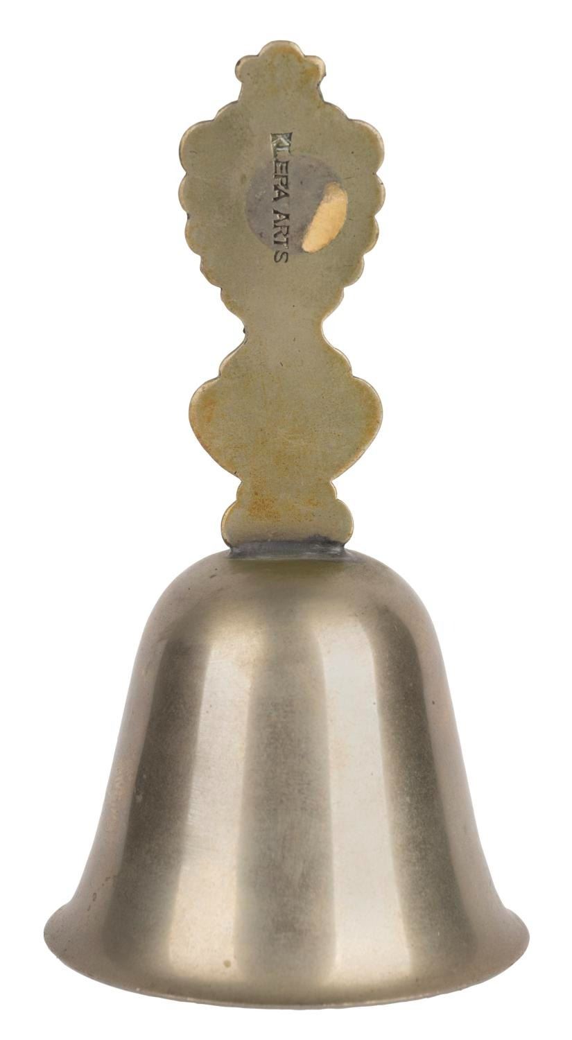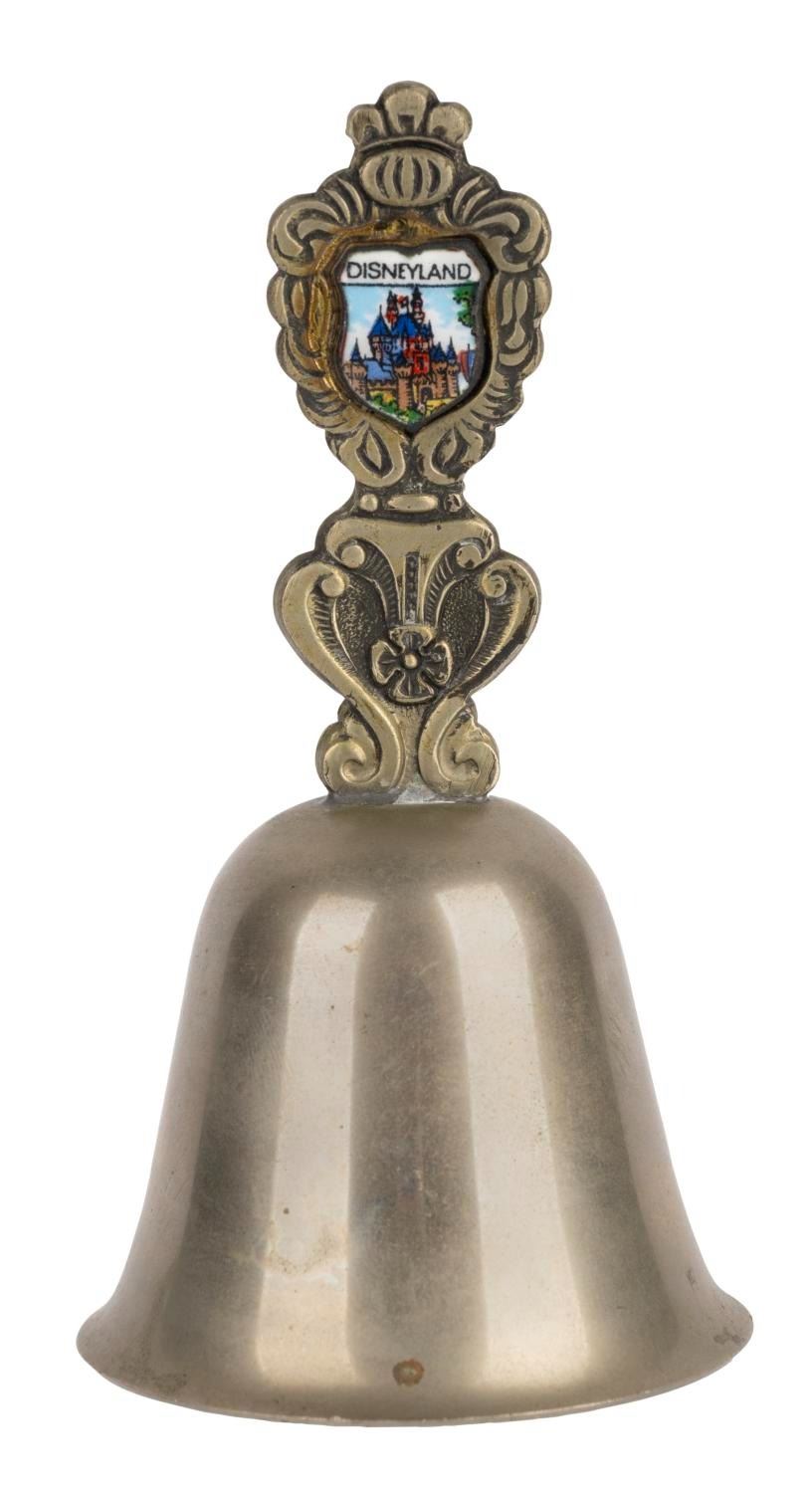 (Klepa Arts, 1960s-70s) A bell souvenir of Disneyland with an enamel-inlaid image of Sleeping Beauty Castle. Measuring 3.5" tall and 1.75" in diameter the bell is in very good condition with minor spots of discoloration, tarnish, and wear.