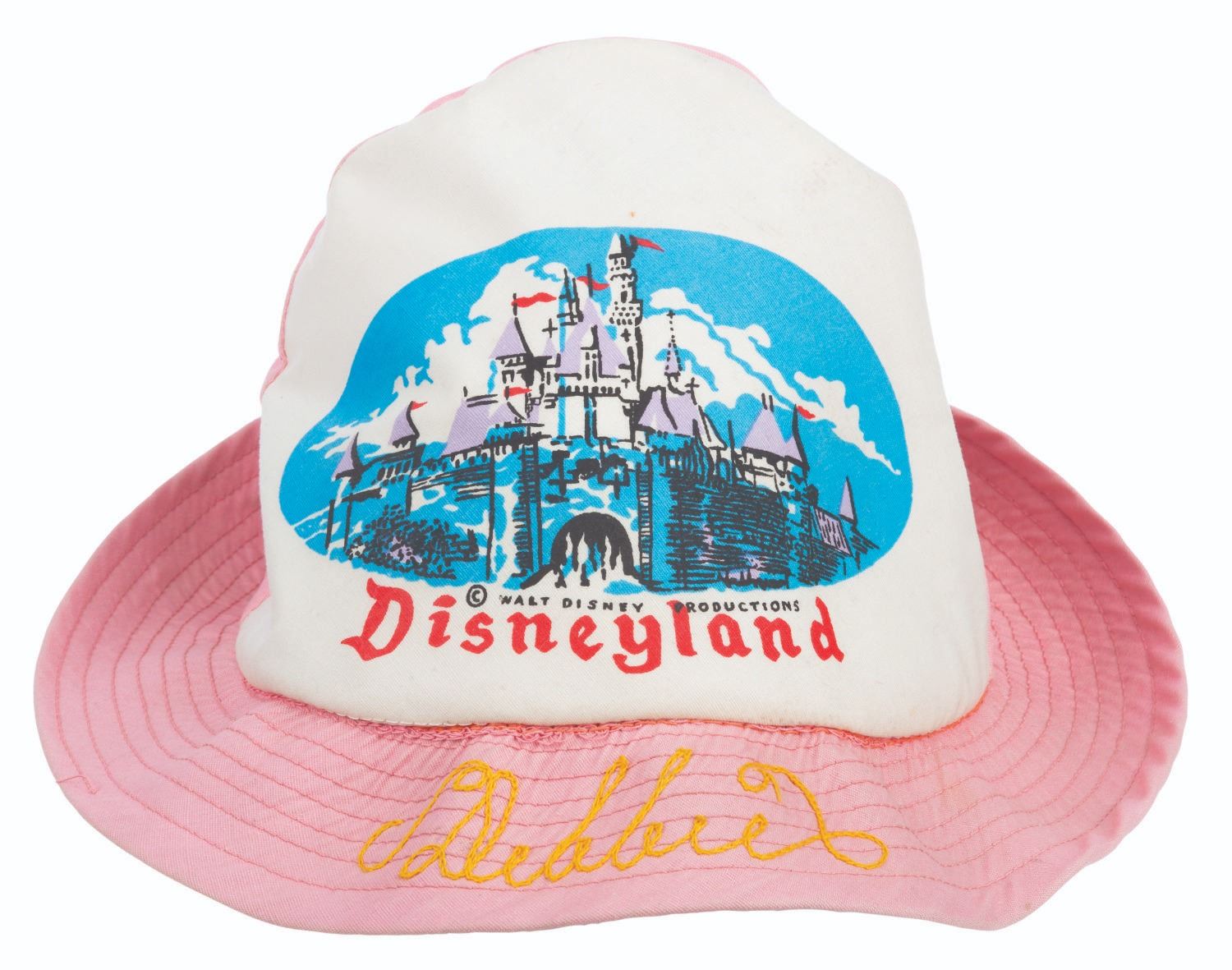(Disneyland, 1960s) A souvenir Disneyland Hat featuring Sleeping Beauty Castle. Measuring a size large, the hat has been personalized with the name "Debbie" and is in very good condition with slight crushing, mild creases to the crown, and wear.