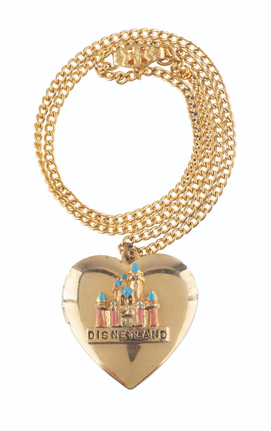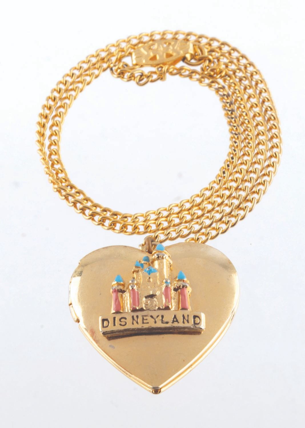 (Disneyland, 1960s) A heart-shaped gold locket and chain with an image of Sleeping Beauty Castle on the front with hand-colored accents. Measuring 1 " x 1 ", the locket is in good condition with minimal wear from age and use.