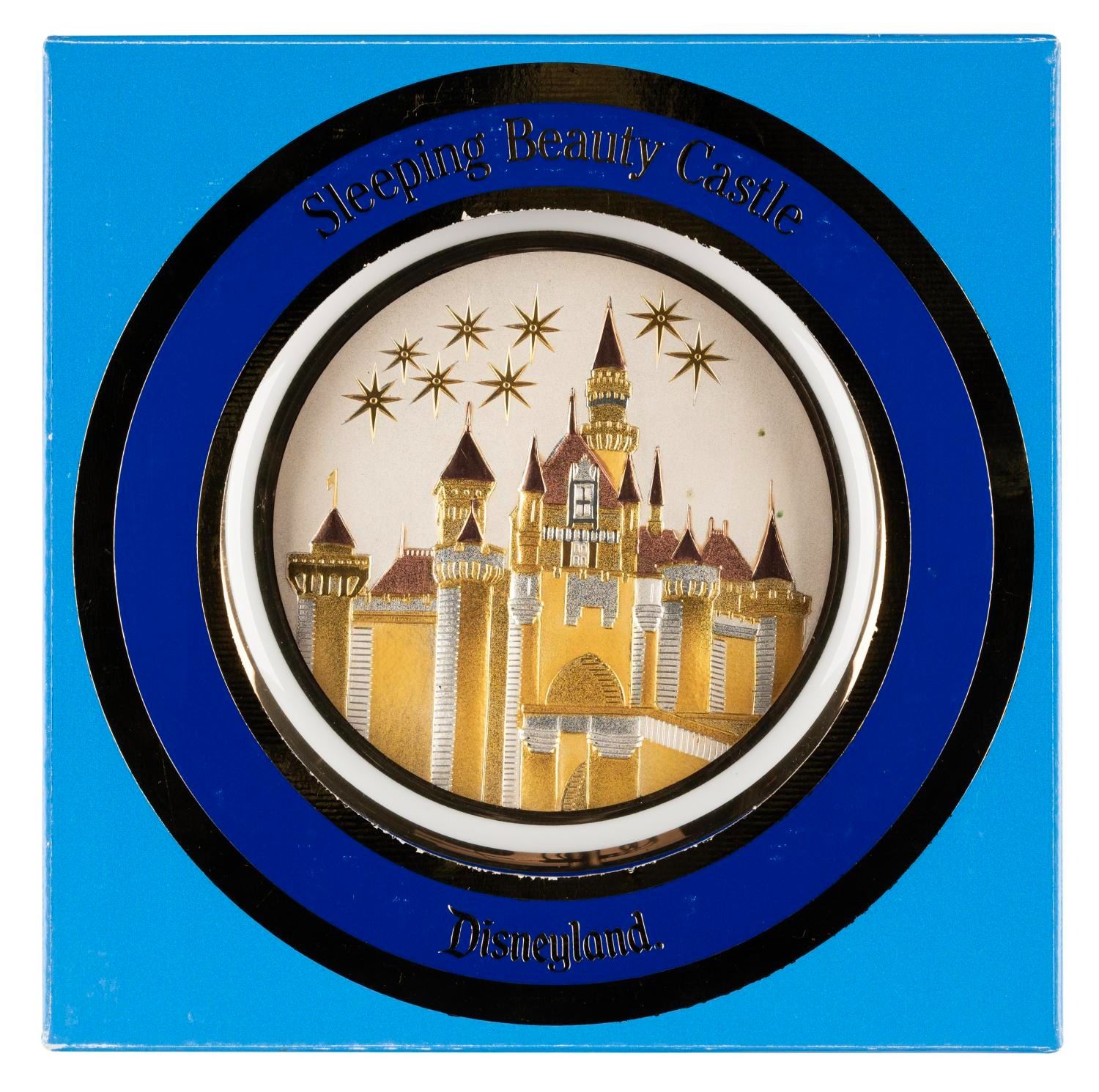 (Disneyland, 1980s-90s) A Sleeping Beauty Castle plate made exclusively for Disney Parks. Measuring 9.25” in diameter with its 9.75” x 9.75” original box, the plate is in good condition with scratches, scuffs, stains, and wear.