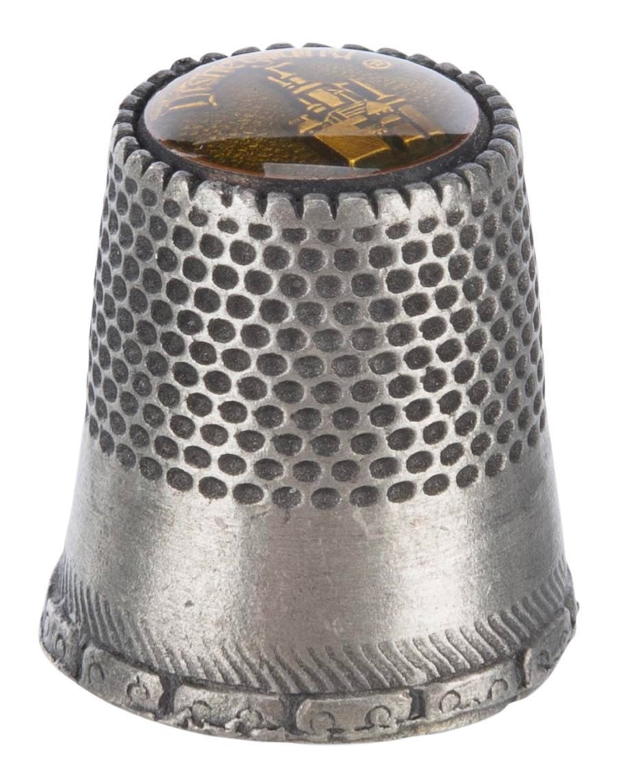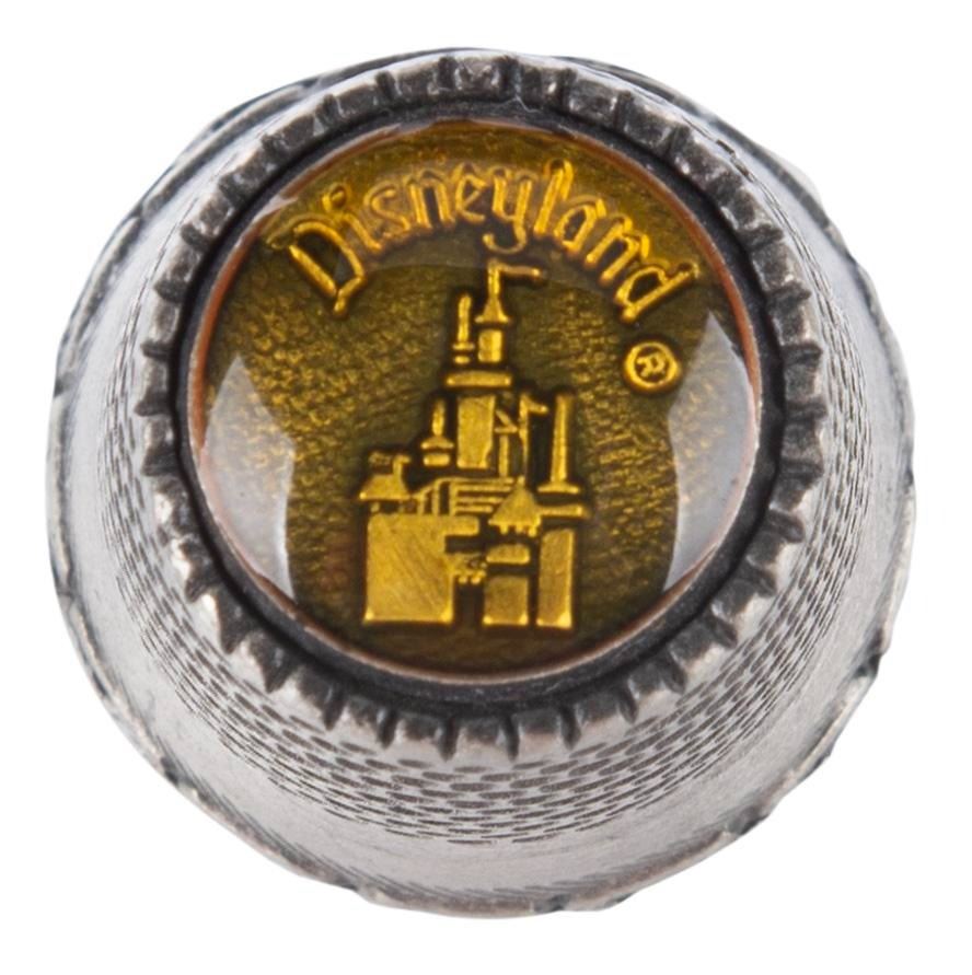 (Disneyland, 1960s) A pewter souvenir of Disneyland thimble featuring Sleeping Beauty Castle. Measuring 0.75” in diameter at its widest point and 0.75' tall, the thimble is in fine condition with yellowing to the enamel top.