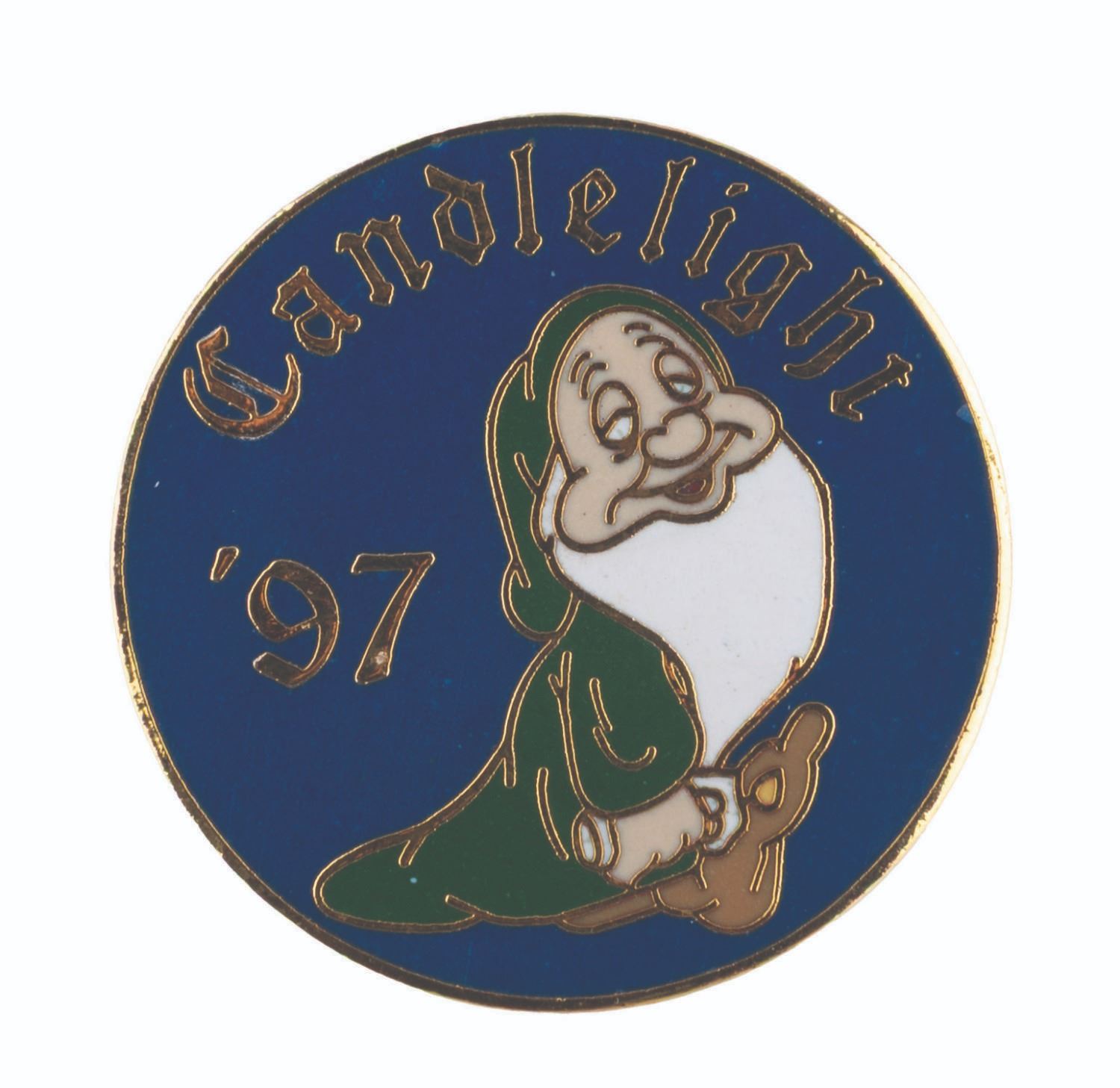 (Disneyland, 1997) A Disneyland Choir Member exclusive enamel pin featuring Sleepy, commemorating the Park's annual Candlelight Procession in 1997. Measuring 1.25” in diameter, the pin is in very good condition with light wear.