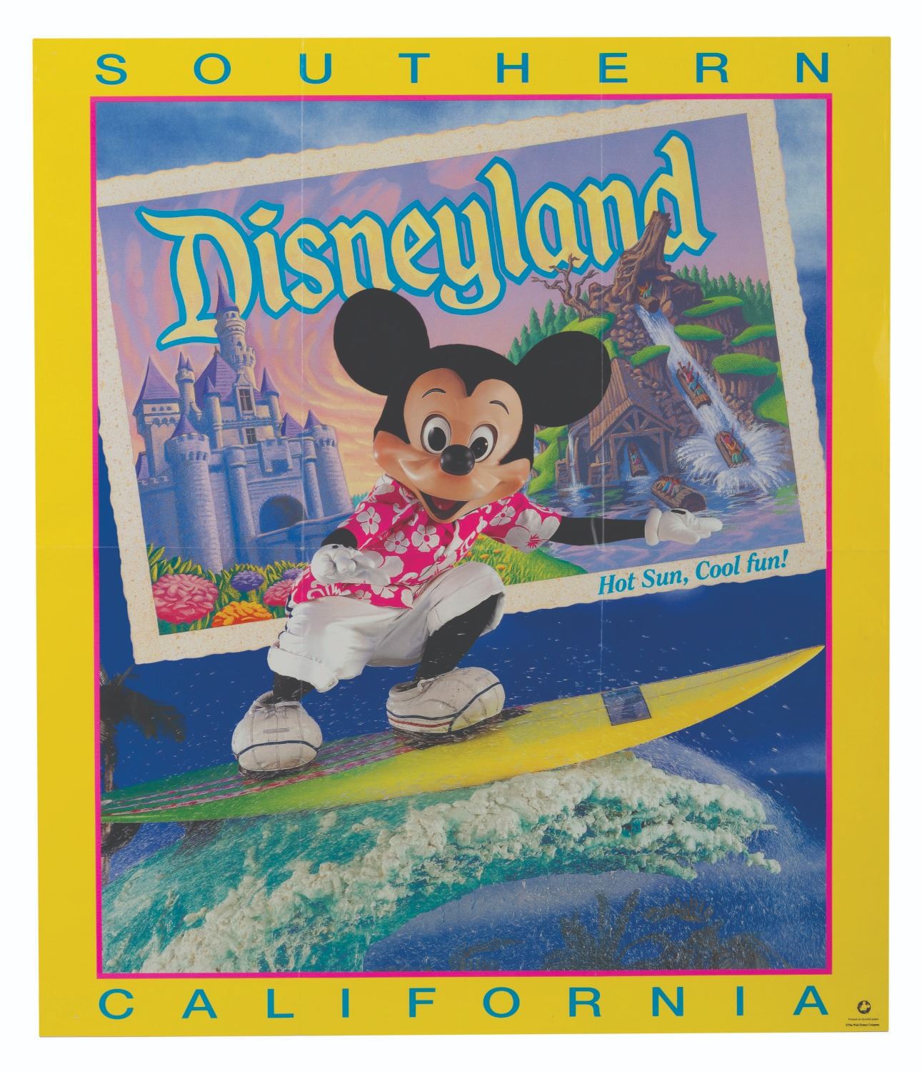 (Disneyland, 1990s) A Disneyland and Southern California Travel Poster, featuring Mickey Mouse. Measuring 24" x 28", the poster is in very good condition with creases around the edges and original folds, a few pinholes, and light wear throughout.
