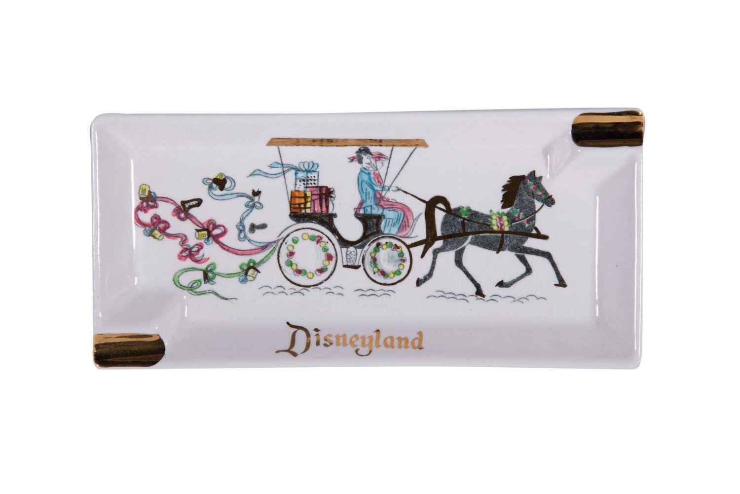 (Disneyland, 1950s) A large Disneyland souvenir ashtray. The glazed ceramic ashtray has been hand-painted with gold leaf accents. Measuring 8.75"x4.25"x.75", the ashtray is in fine condition.