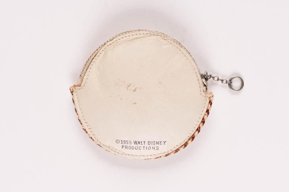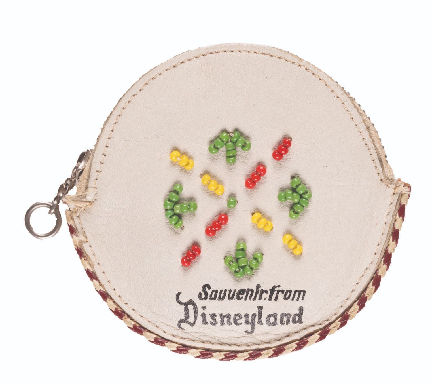 (Disneyland, 1955-60s) A souvenir of Disneyland coin purse accented with beads. Measuring 3.5” in diameter, the purse is in very good condition with few light creases and wear to leather from age and handling.