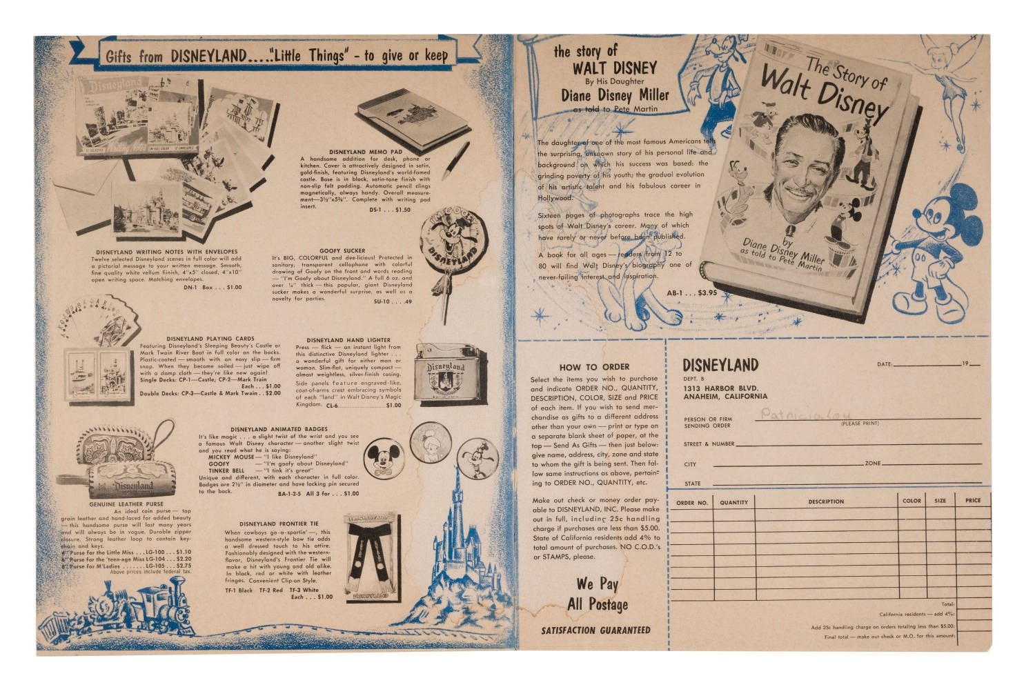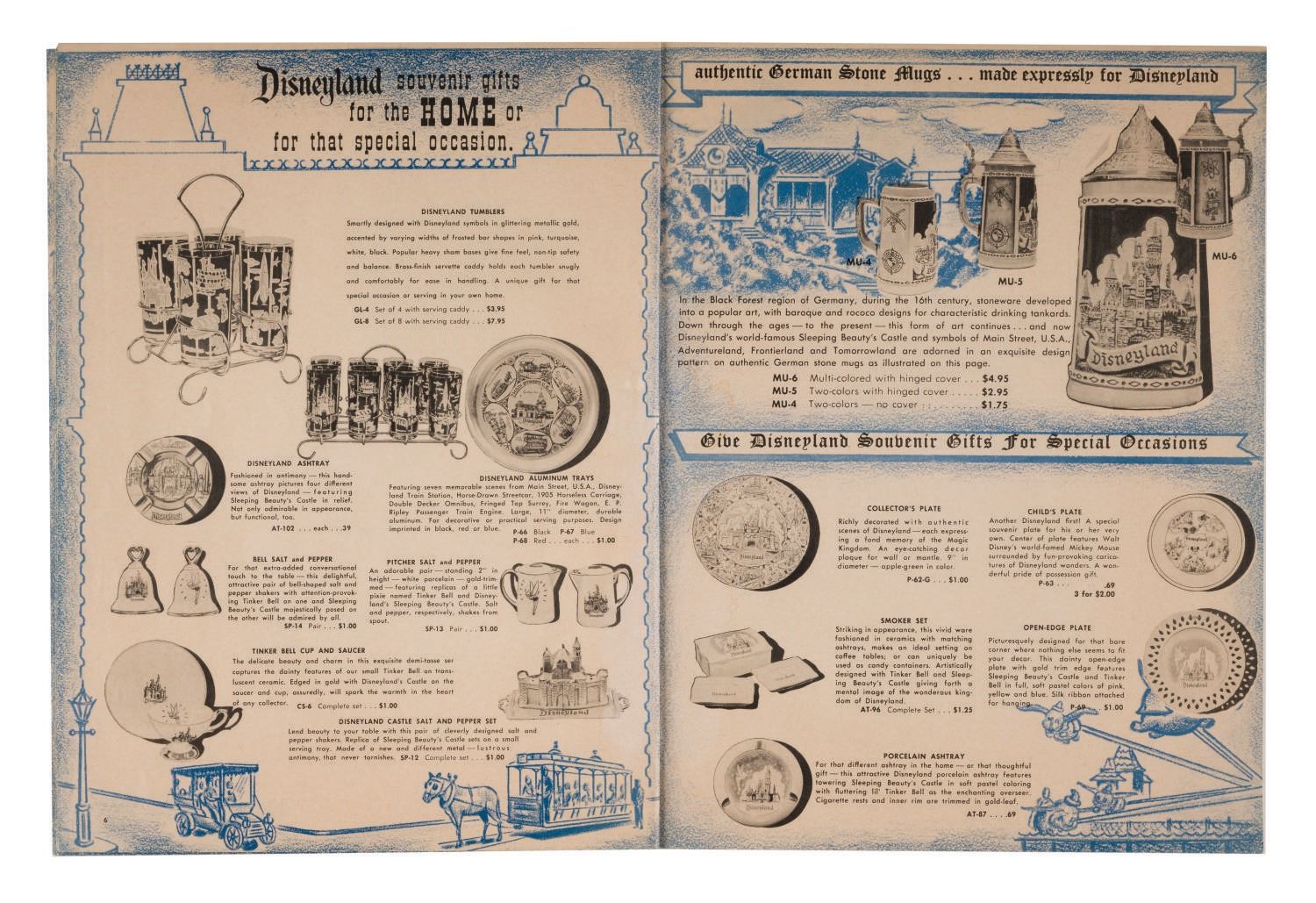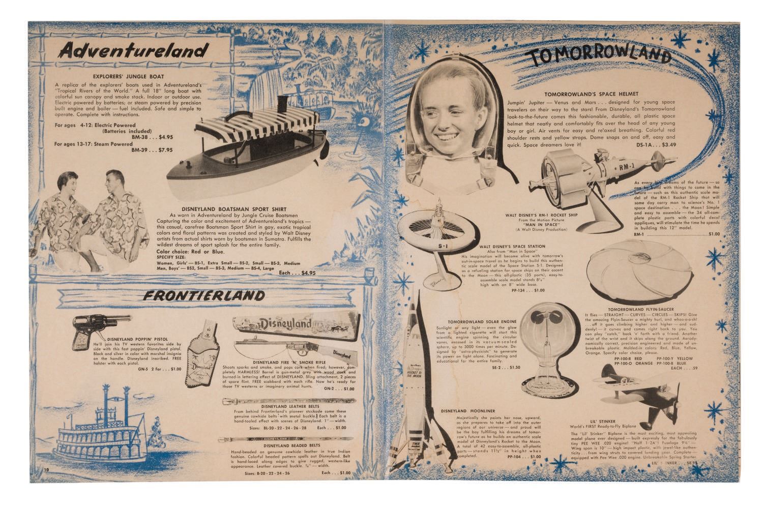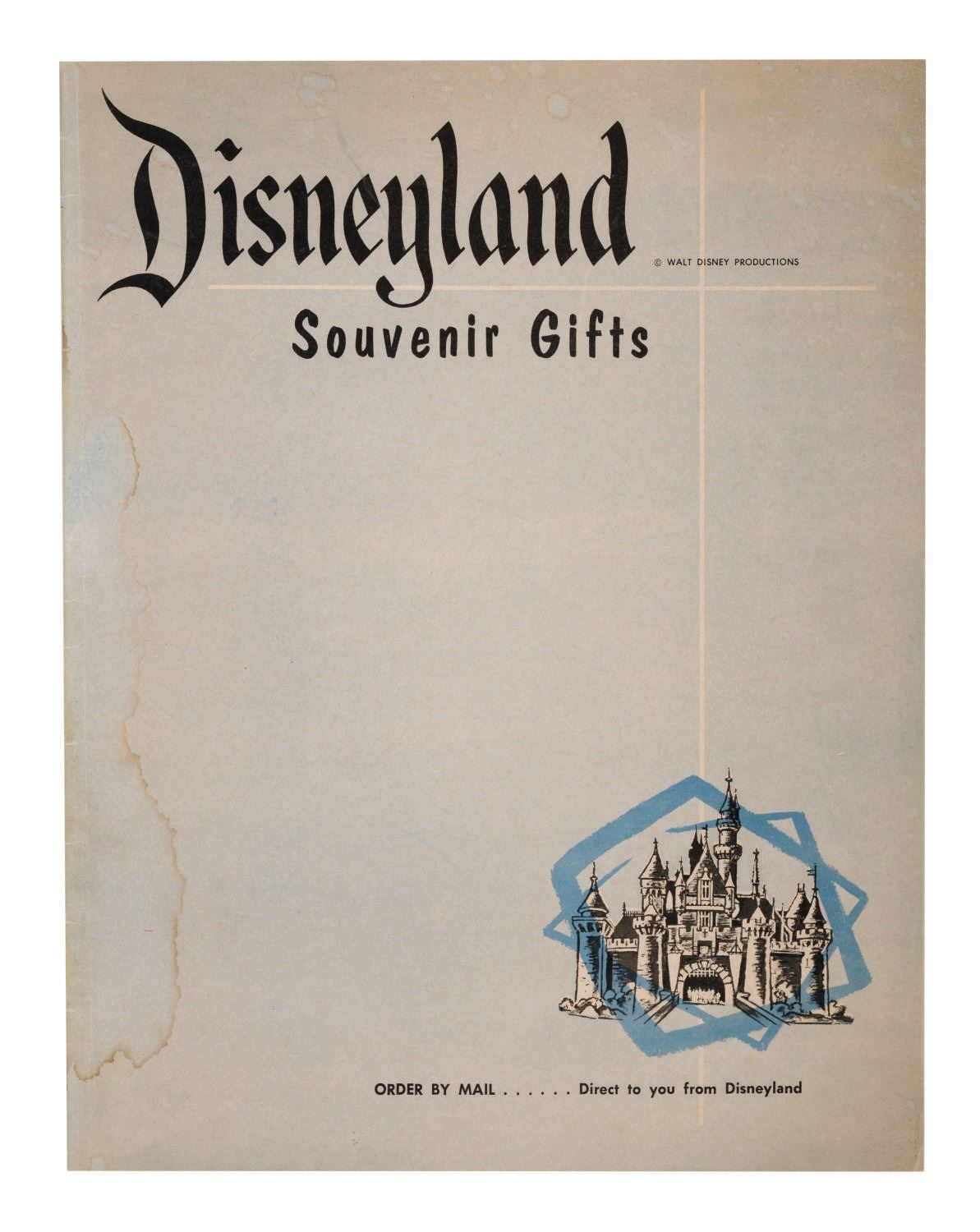(Disneyland, 1958) A Mail Order Souvenir Gift Catalog from Disneyland. This extremely rare piece of early Disneyland ephemera in (16) pages gives an extensive overview of early souvenirs that have now become much sought-after collectibles. Measuring 8"x10.25", this rare piece is in very good condition, even with light wear from handling and water staining along the spine.