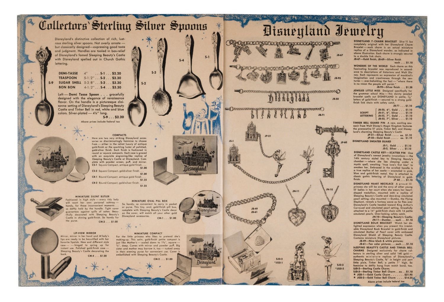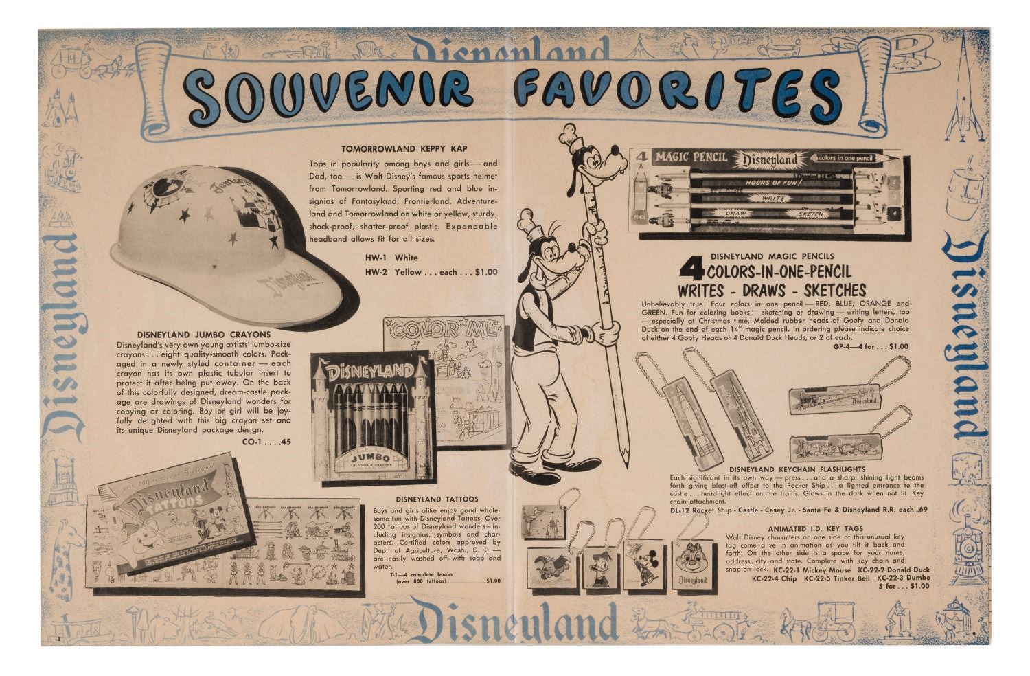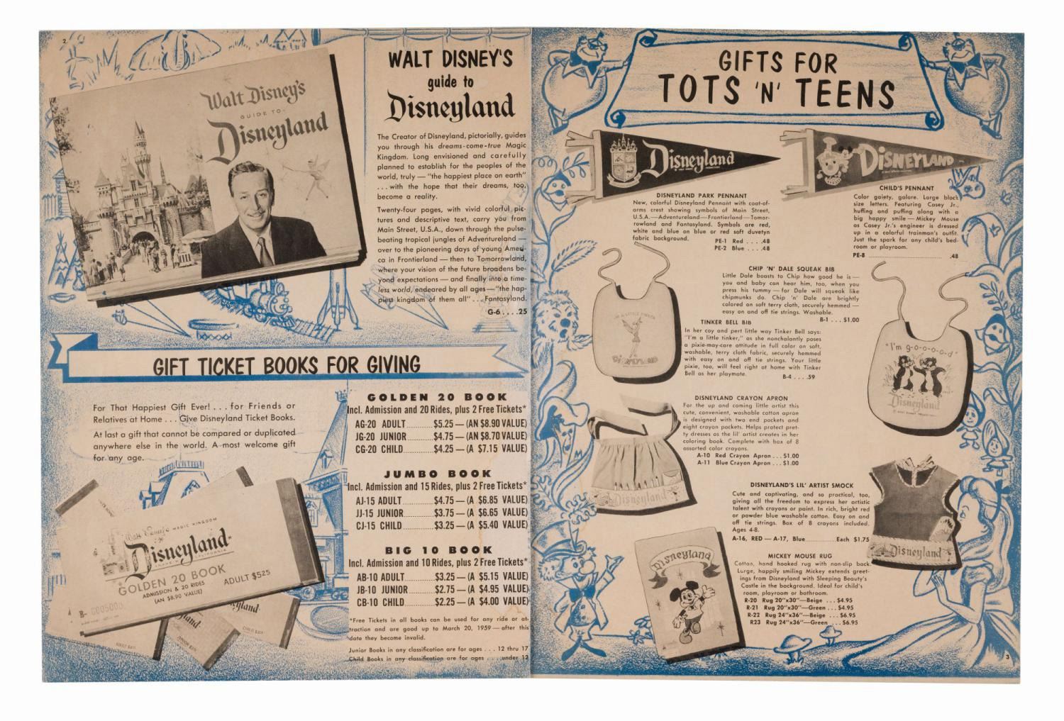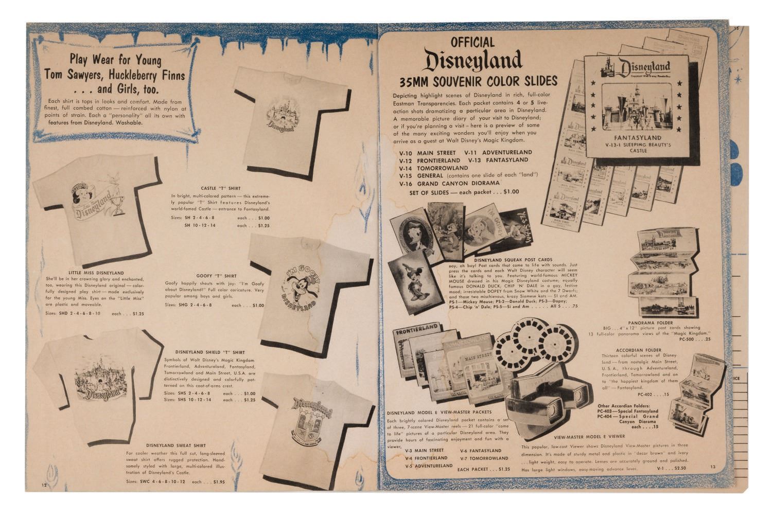 (Disneyland, 1958) A Mail Order Souvenir Gift Catalog from Disneyland. This extremely rare piece of early Disneyland ephemera in (16) pages gives an extensive overview of early souvenirs that have now become much sought-after collectibles. Measuring 8"x10.25", this rare piece is in very good condition, even with light wear from handling and water staining along the spine.