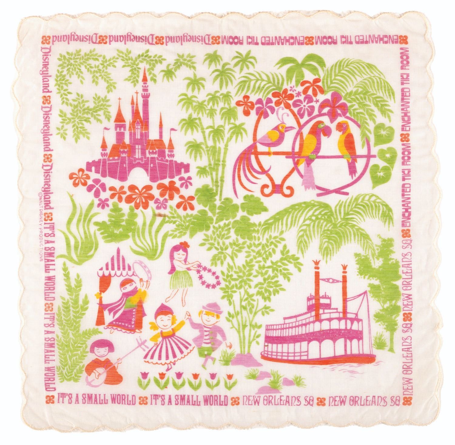 (Disneyland, 1960s-70s) A souvenir handkerchief featuring six-color imagery of It's a Small World, New Orleans Square, the Enchanted Tiki Room, and Sleeping Beauty Castle at Disneyland. Measuring 11.75"x12", the piece is in very good condition exhibiting fading and wear from handling and age.