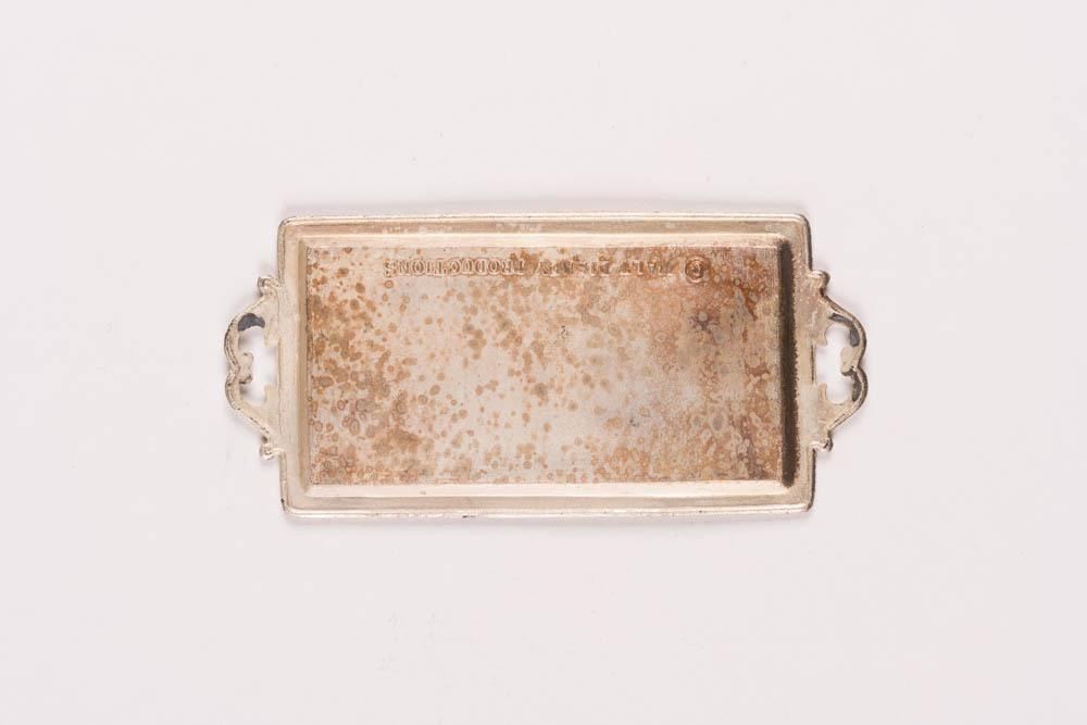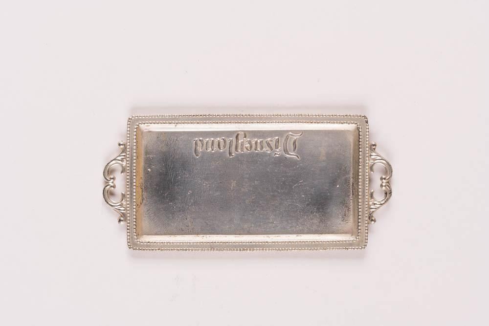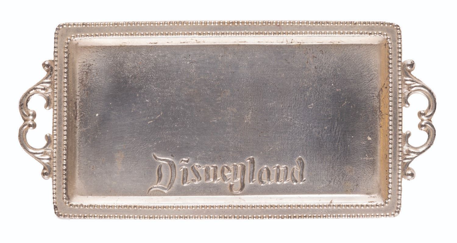 (Disneyland, 1960s) A small souvenir Disneyland tray. Measuring 4.5”x2.25”, the metal tray is in good condition with few minor scuffs throughout and spots of tarnish on reverse.