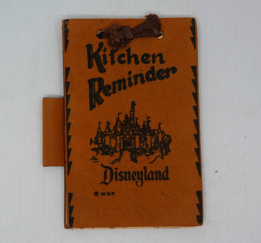 (Disneyland, 1950s-60s) An early leather Kitchen Reminder souvenir book from Disneyland with lists of household and grocery items to be circed when needed. The book is backed with trimmed cardboard and an attached leather pencil holder. Measuring 5.25” x 4”, the book is in very good condition with wear from age, creasing to the cardboard backing, some used interior pages, and a small corner torn from the backing.