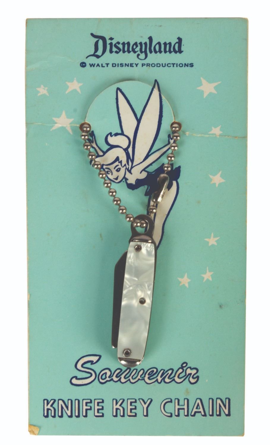 (Disneyland, 1950s-60s) A souvenir knife keychain featuring a pearl-finished handle, two blades, and a ball chain, on its original card featuring Tinker Bell. Measuring 2.5” x 5”, the knife is in very good condition with some foxing and slight wear to the backing card.