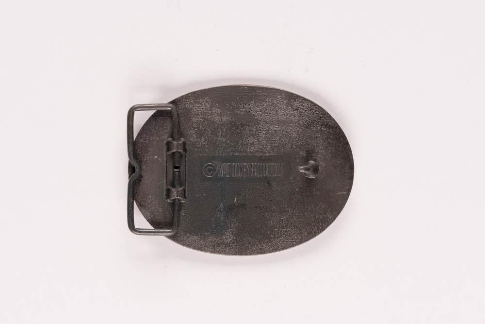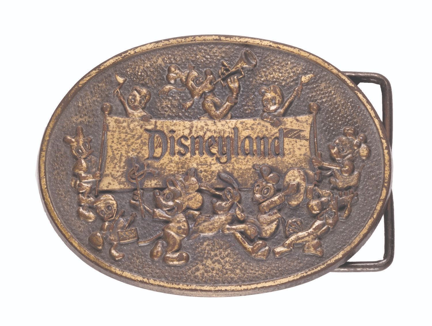 (Disneyland, 1970s) A souvenir Mickey and Friends Belt Buckle. Measuring 3.5” x 2.75”, the metal buckle is in very good condition with scuffs and tarnish throughout from handling and age.