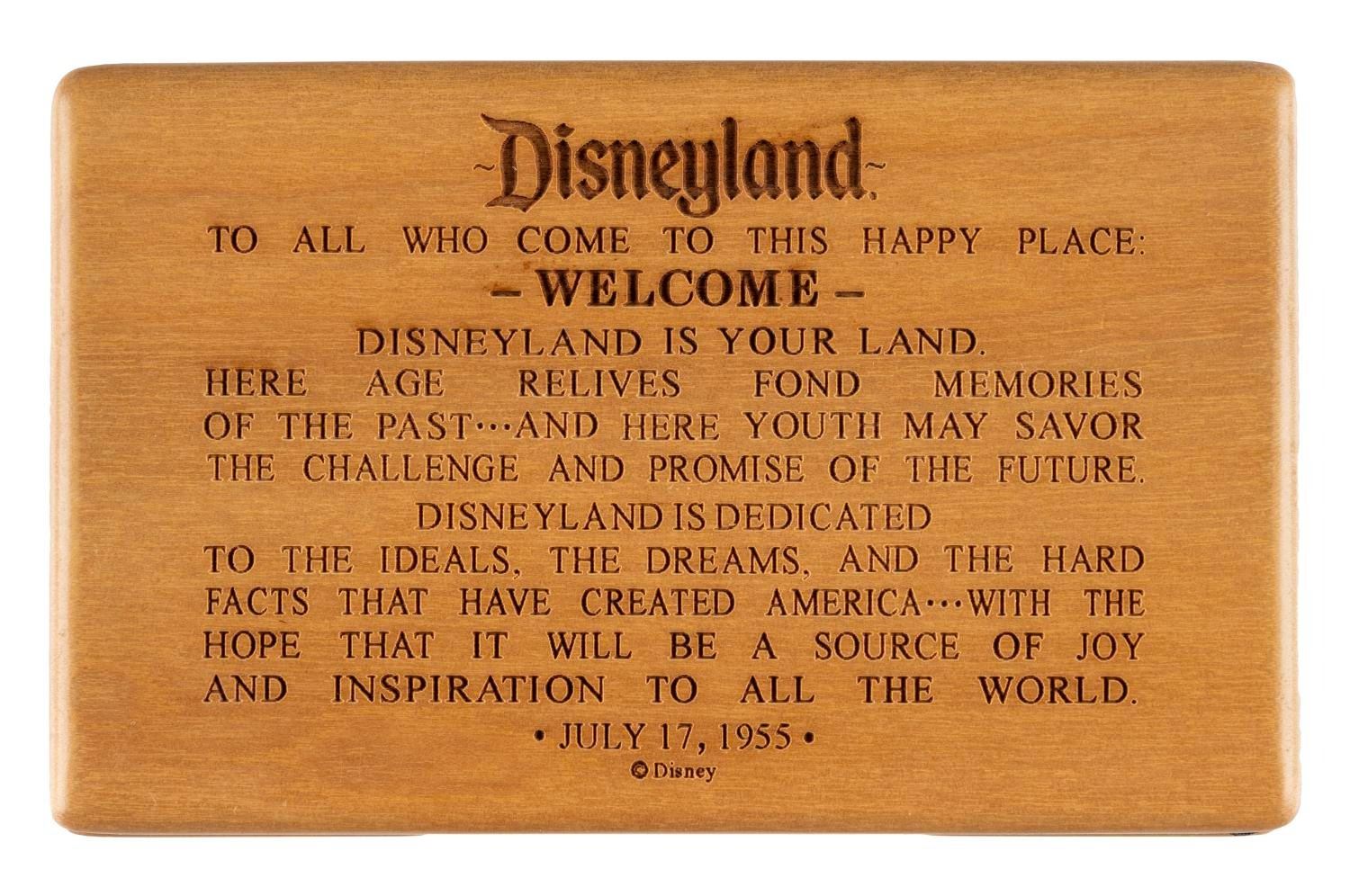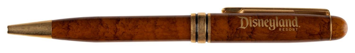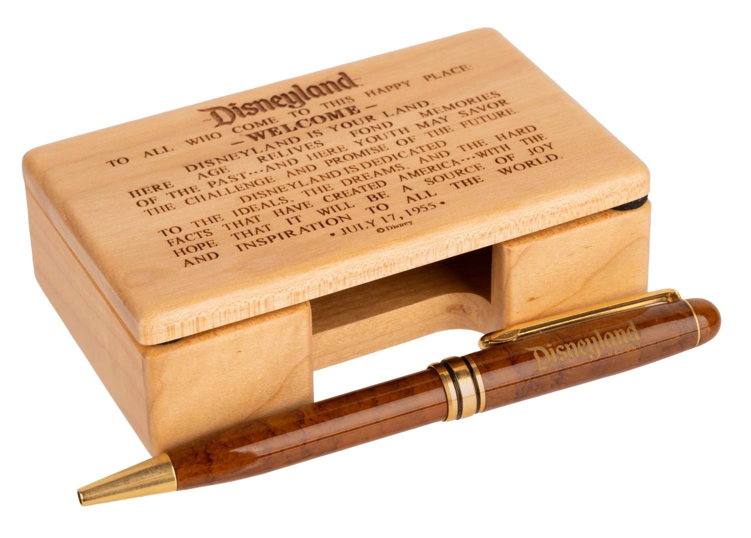 (Disneyland, 1990s-2000s) A Disneyland souvenir pen and wooden box inscribed with a portion of Walt Disney's Dedication speech. Measuring 4.25"x2.75"x1.5", the hinged and polished wooden box is in fine condition. Measuring 5.5" long, the pen is in fine non-working condition, requiring an ink refill.