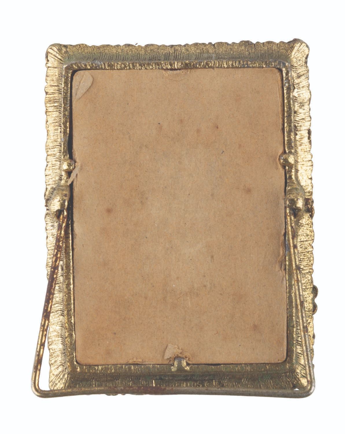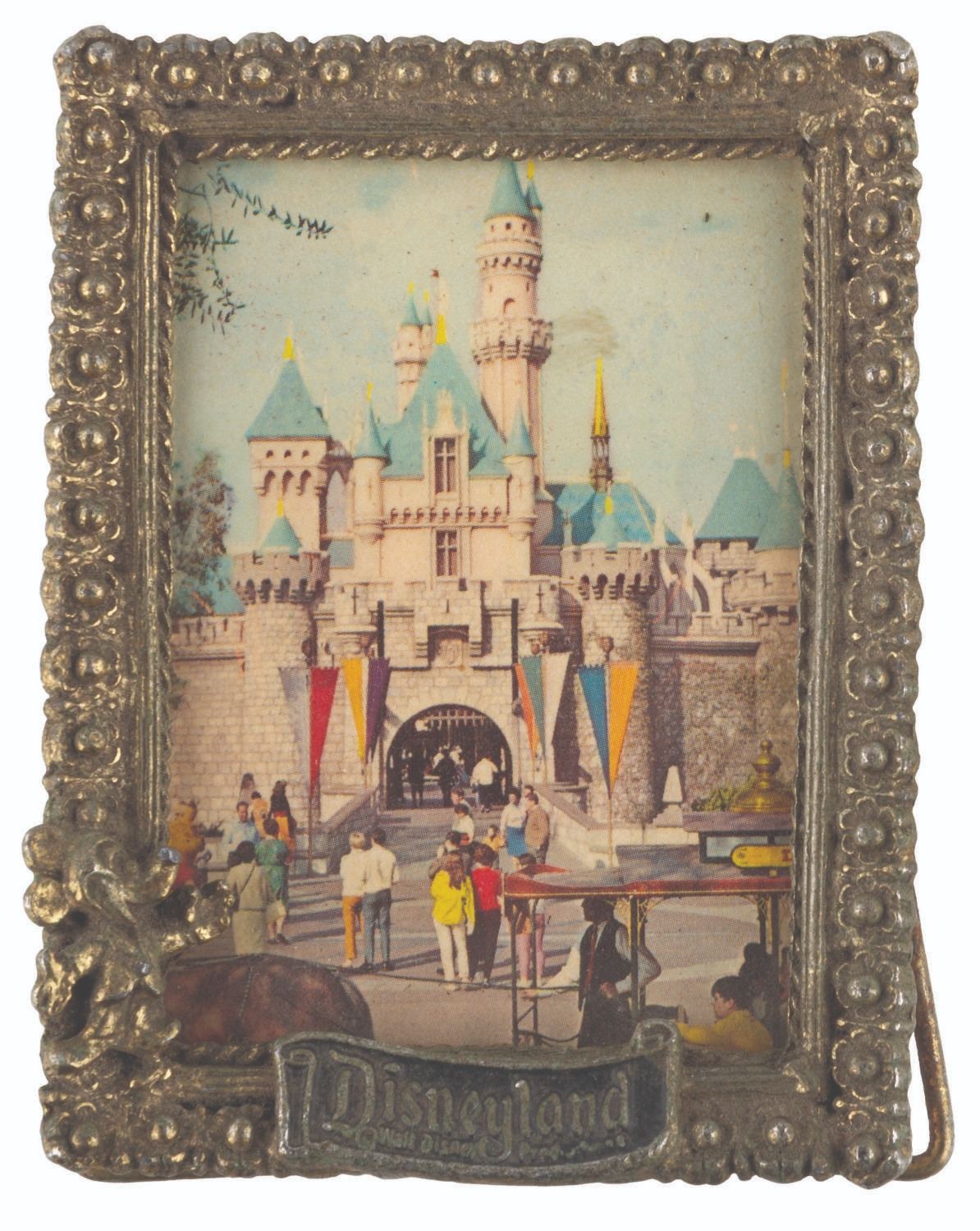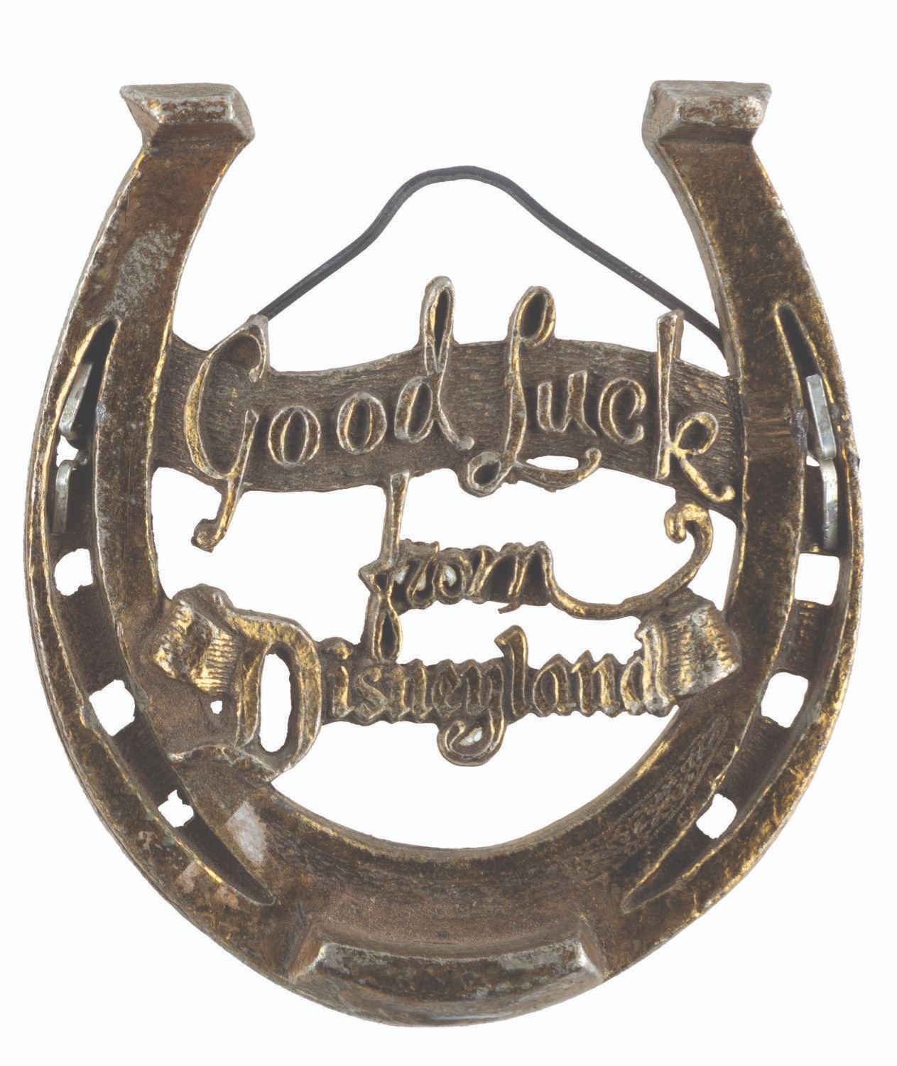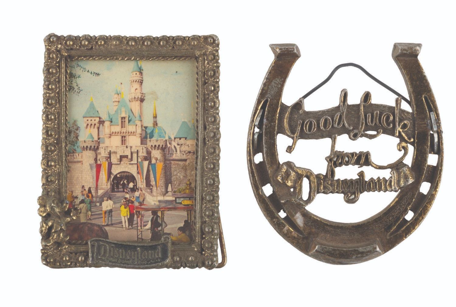 (Disneyland, 1960s) A souvenir metal picture frame featuring Mickey Mouse and a"Good Luck from Disneyland” Horseshoe. Measuring up to 3” x 3.75”, the souvenirs are in good condition with wear from handling and age.