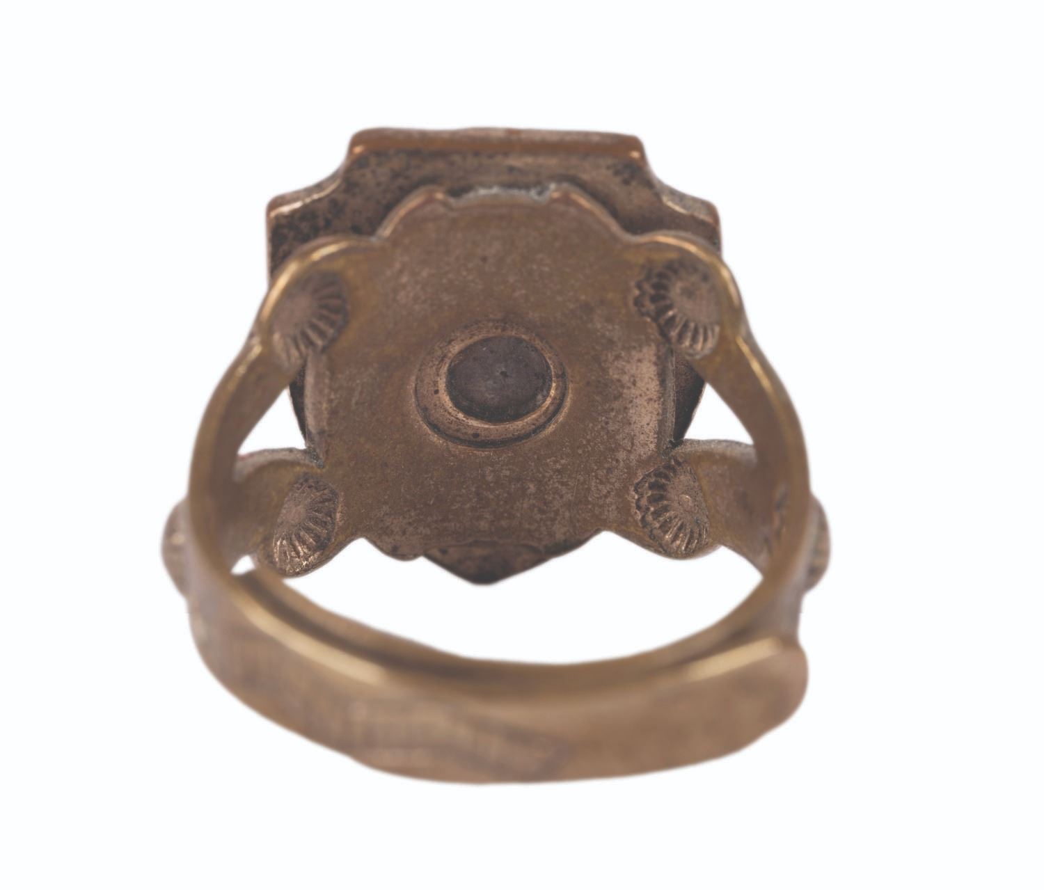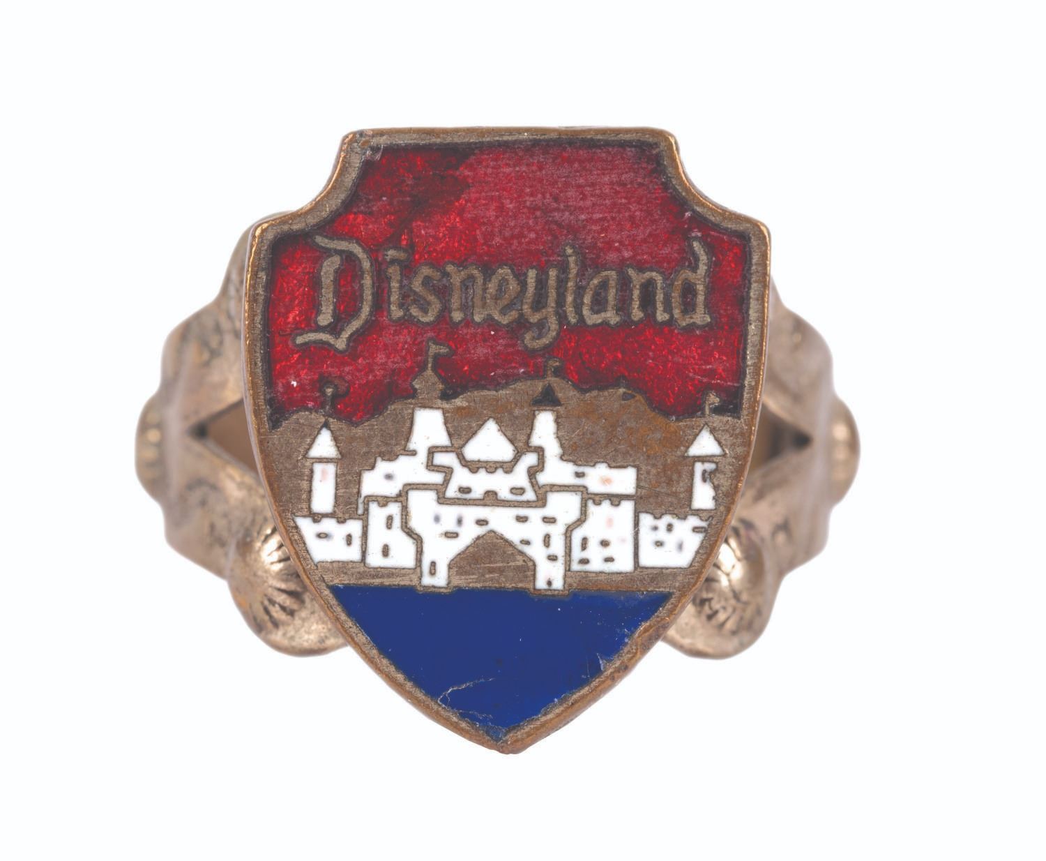 (Disneyland, 1950s) A small children's ring souvenir of Disneyland featuring an enamel image of Sleeping Beauty Castle. Measuring .75" in diameter, the adjustable ring is in good condition with light wear.