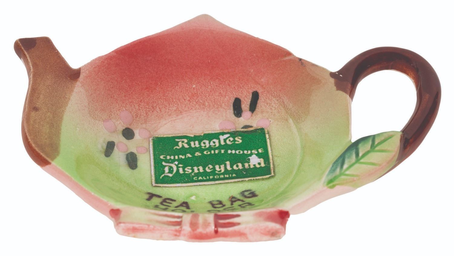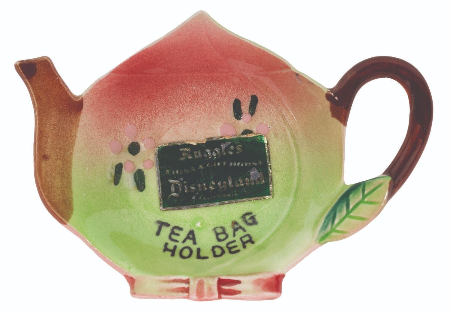 (Disneyland, 1955-1964) A rare ceramic tea bag holder from Ruggles China & Glass House at Disneyland, retaining the original green Ruggles label. Measuring 3” x 4.5” x 1” tall, the tea bag holder is in very good condition with light wear on the sticker and small flaws typical of the glazing process, notably above the text.