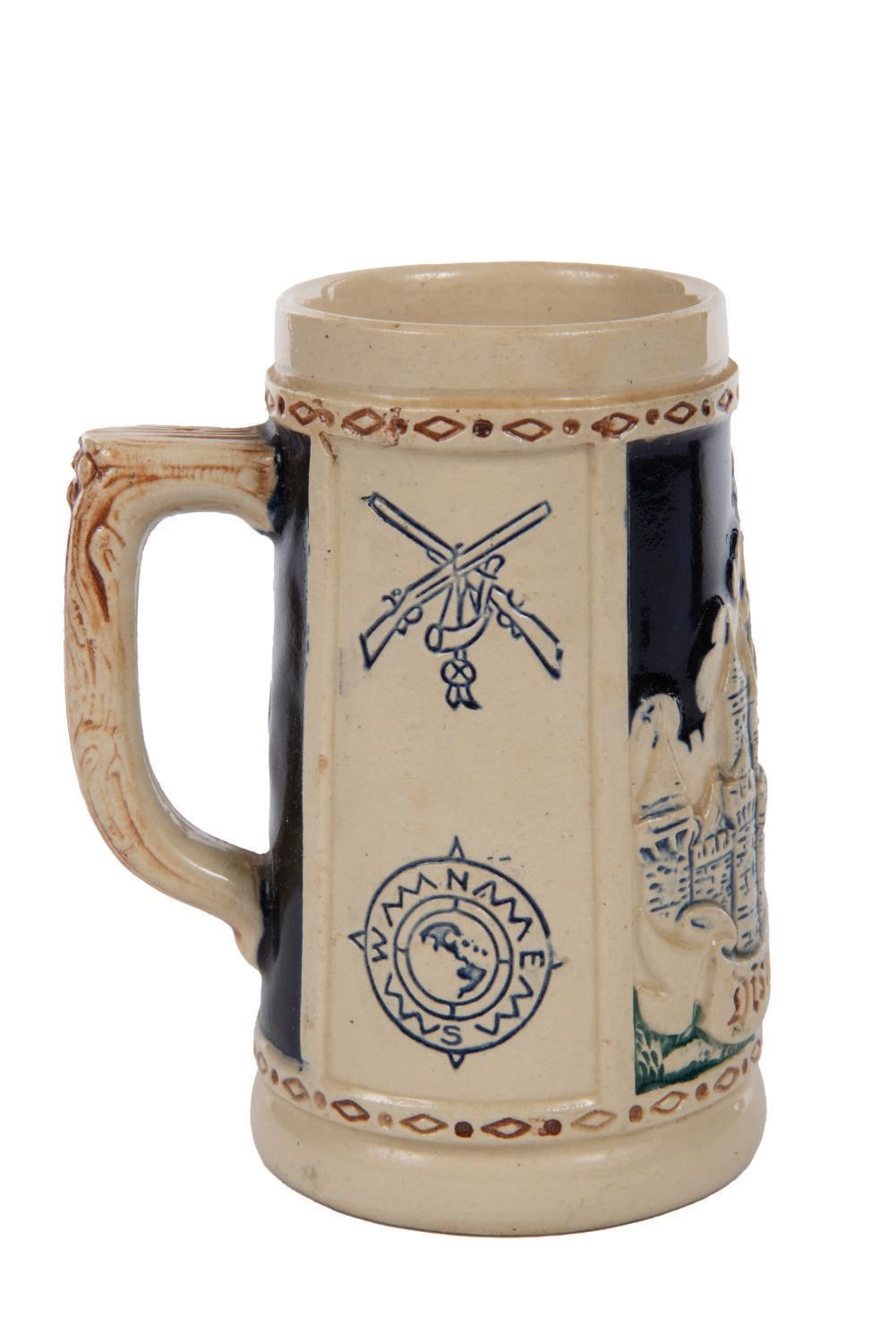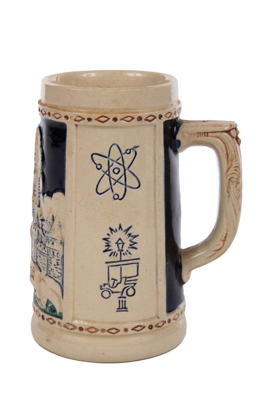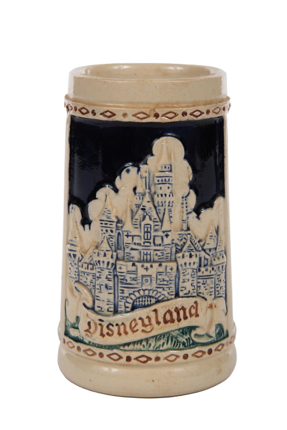 (Disneyland, 1956) A decorative souvenir ceramic stein featuring imagery of Sleeping Beauty Castle and symbols representing the different lands. This German-manufactured stein measures 3.25" in diameter and 7" tall and is in fine condition.
