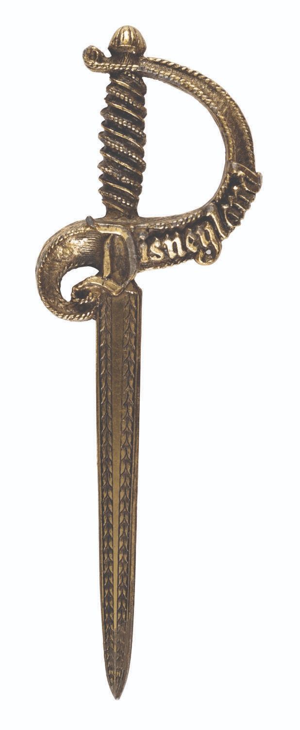 (Disneyland, 1960s-1970s) A souvenir sword-shaped letter opener with Disneyland sculpted in the hand guard. These were sold in New Orleans Square as early Pirates of the Caribbean merchandise. Measuring 6.25"x2", the letter opener is in very good condition, with light wear to the gold tone on edges.