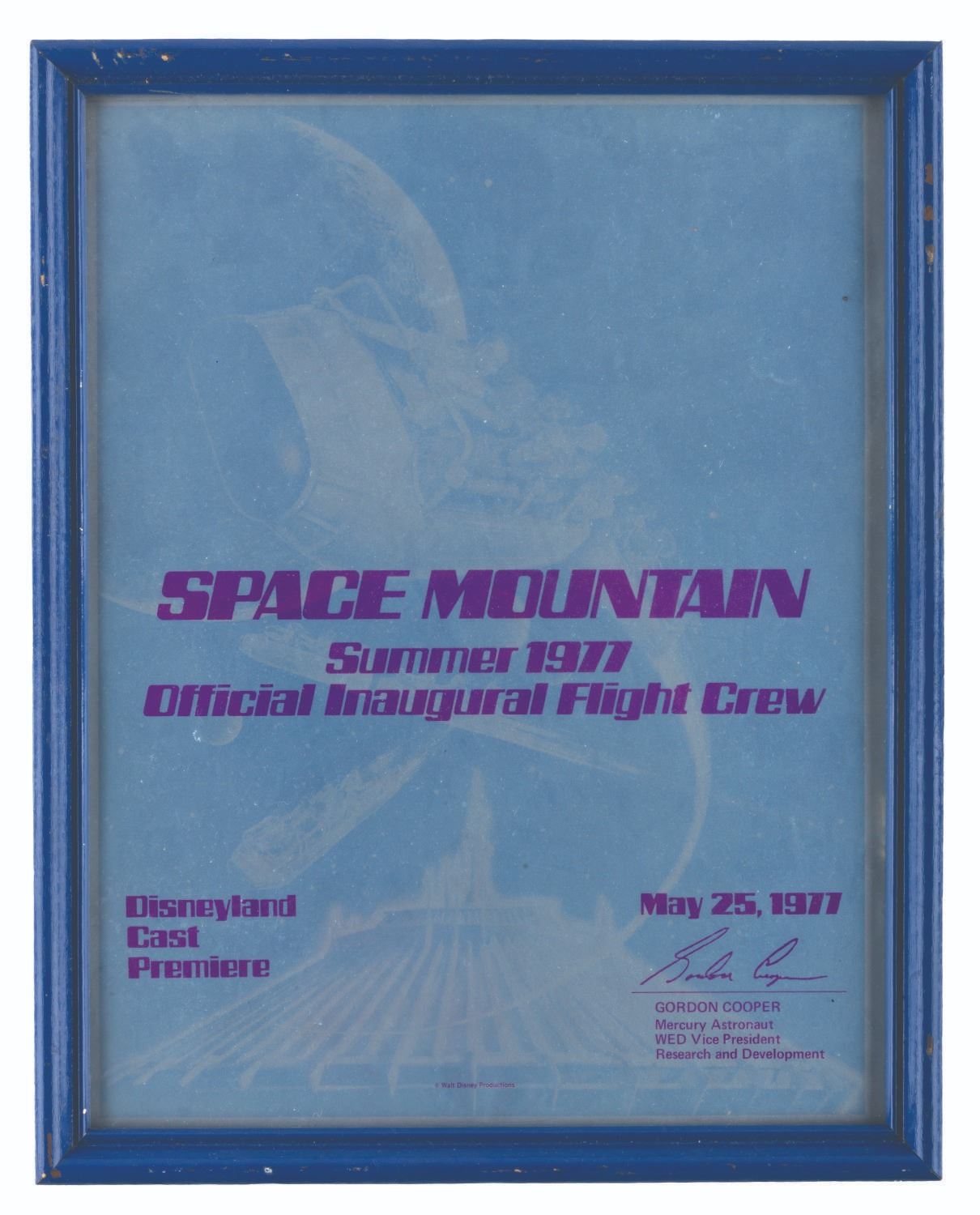 (Disneyland, 1977) An"Inaugural Flight” certificate from Disneyland's Cast Member premiere of Space Mountain, dated May 25, 1977, two days before the attraction opened to the general public. Measuring 8.5” x 11”, the certificate is in very good condition.