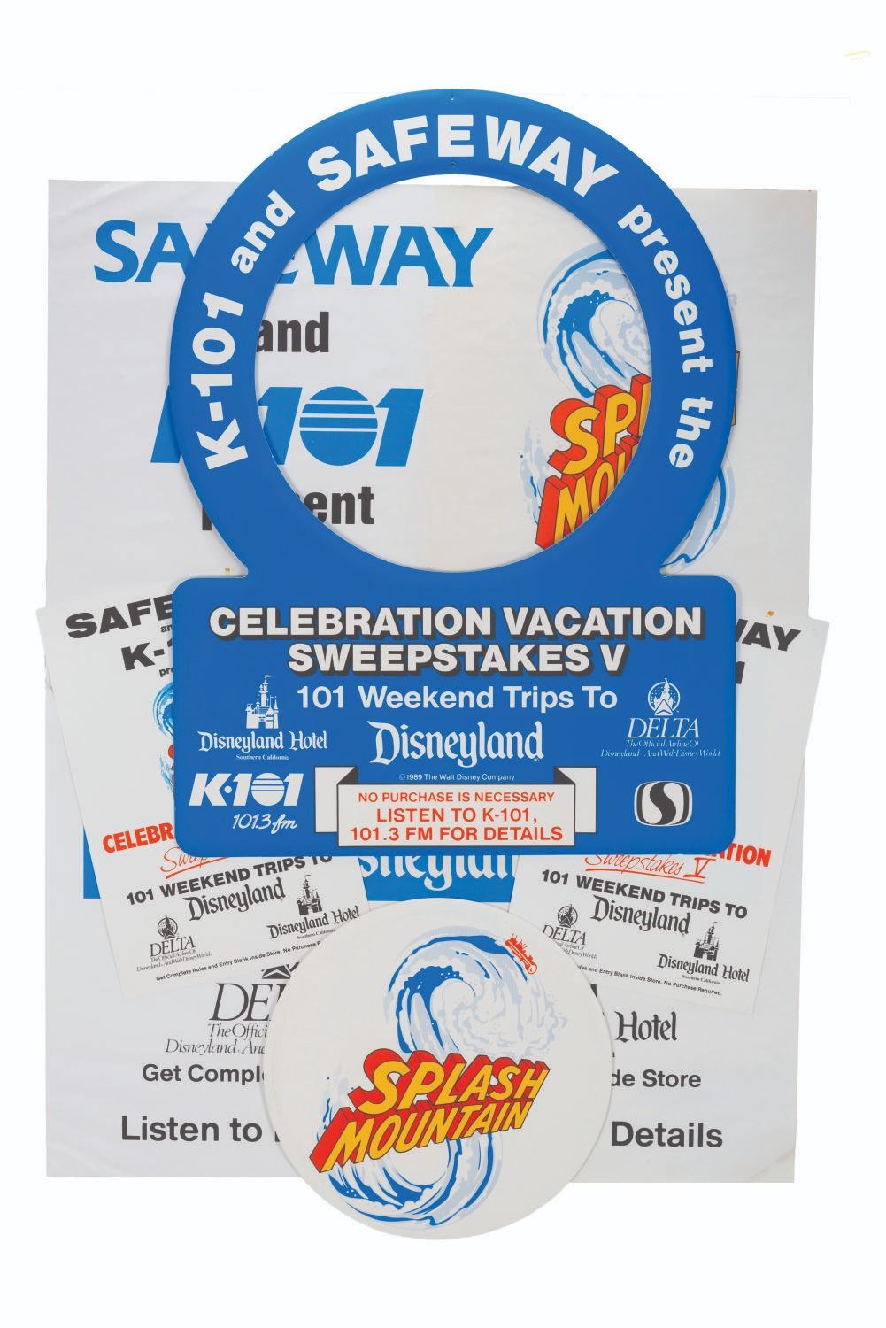 (Disneyland, 1989) A Splash Mountain Disneyland Celebration Vacation Sweepstakes V display. Presented by K-101, Safeway, and Delta, the sweepstakes awarded 101 weekend trips to Disneyland. Included in the display kit are a large 28 " x 38 " hanging mobile frame with a rotating Splash Mountain disk and hanging hardware, a huge 38 " x 50 " poster, and two smaller 13 " x 20 " posters. The display is in good condition with staining spots in the corners of the posters and light creases, scuffs, and edge wear throughout.