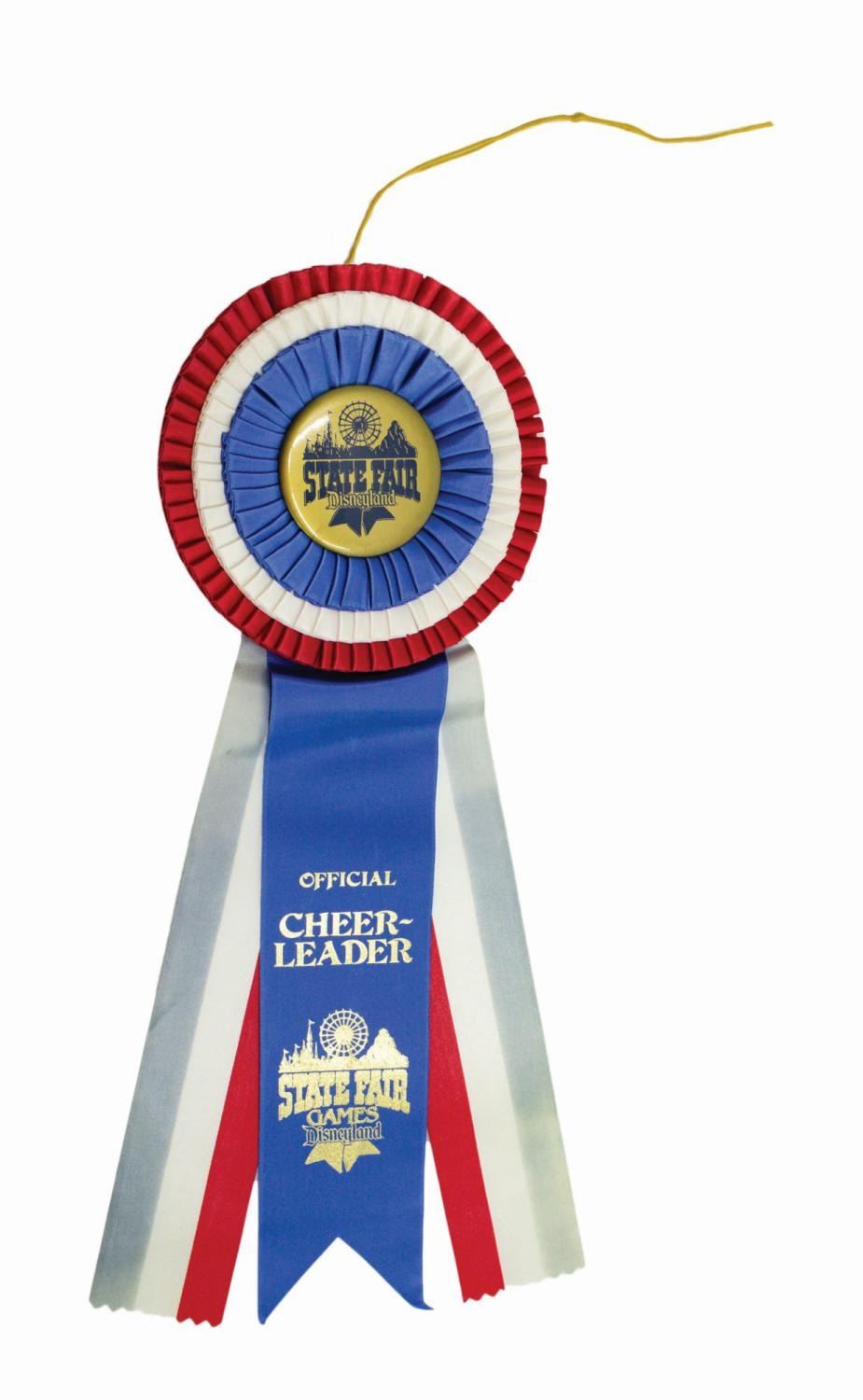 (Disneyland, 1987) A Disneyland State Fair "Official Cheerleader" Rosette Button with Steamers. These awards were given to audience members who were selected to cheer on their favorite porcine competitor of the "Pigmania" Pig Races held at Big Thunder Ranch. The entire piece measures 13.75" in length. It is in fine used condition, with minor creases and wear to the ribbons from previous display.