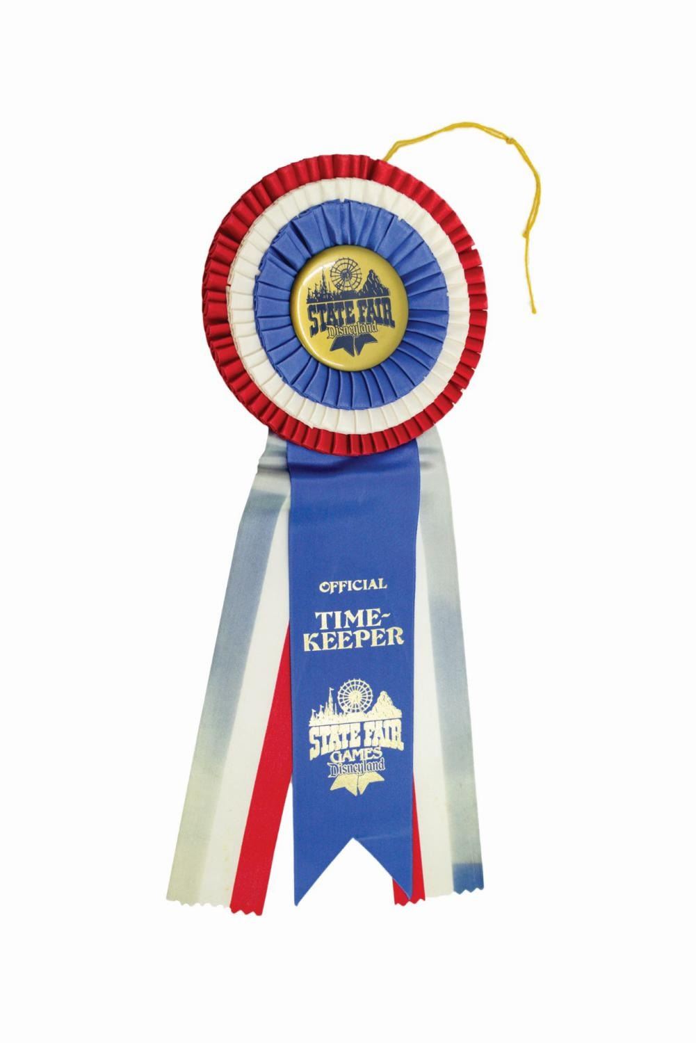 (Disneyland, 1987) A Disneyland State Fair Official Timekeeper Rosette Ribbon. These awards were given to audience members who participated in games during the second season of Disneyland State Fair.  The entire piece measures 13.75" in length. It is in fine used condition, with minor creases and wear to the ribbons from previous display.