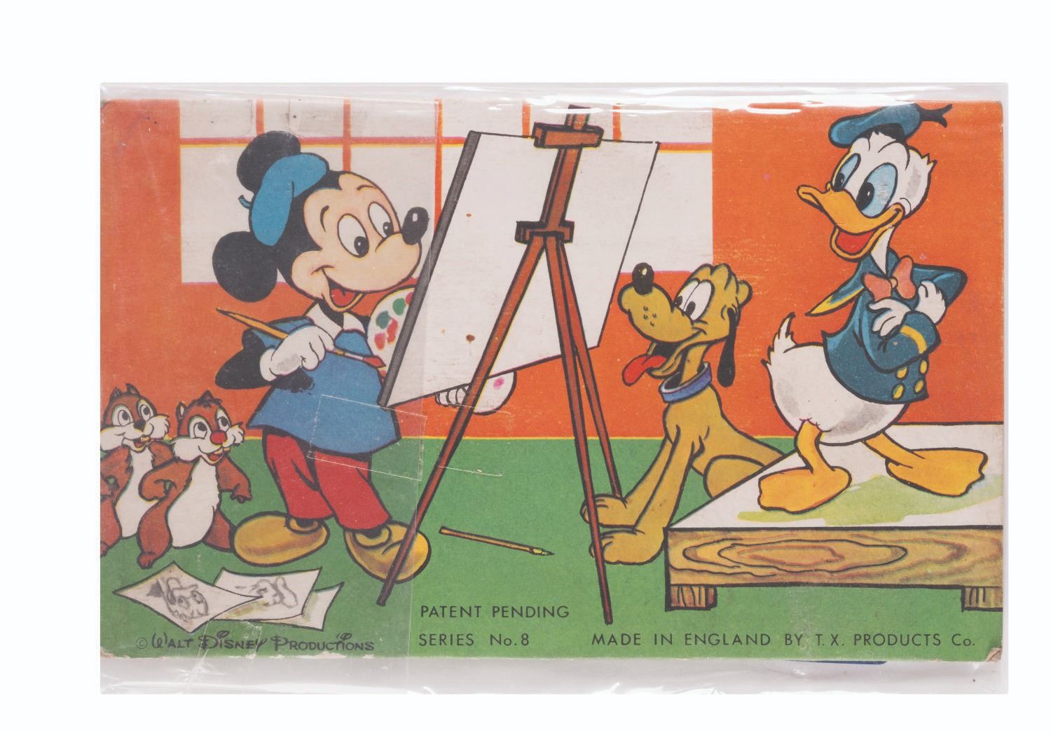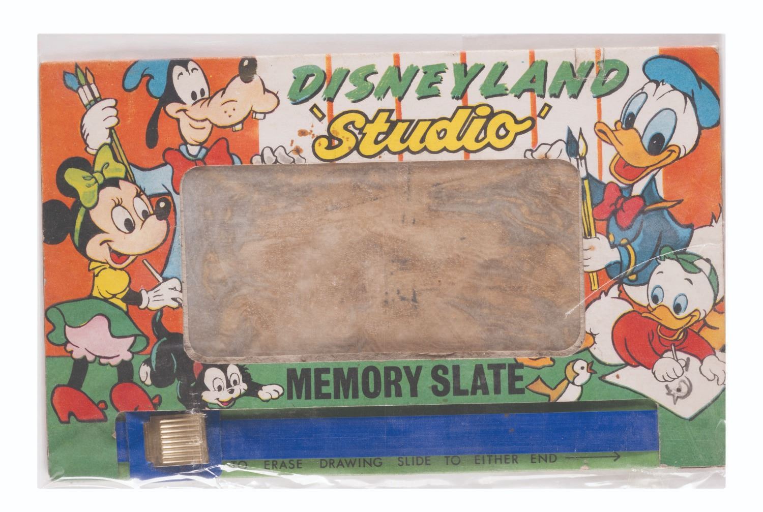(T.X. Products, 1950s) A Disneyland Studio Memory Slate by T.X. Products. Measuring 8.5”x5.5”, the toy displays in good condition with spots of discoloration and wear throughout, though non-functional due to aging of the internal overlay sheet.