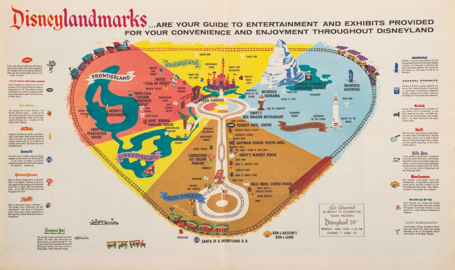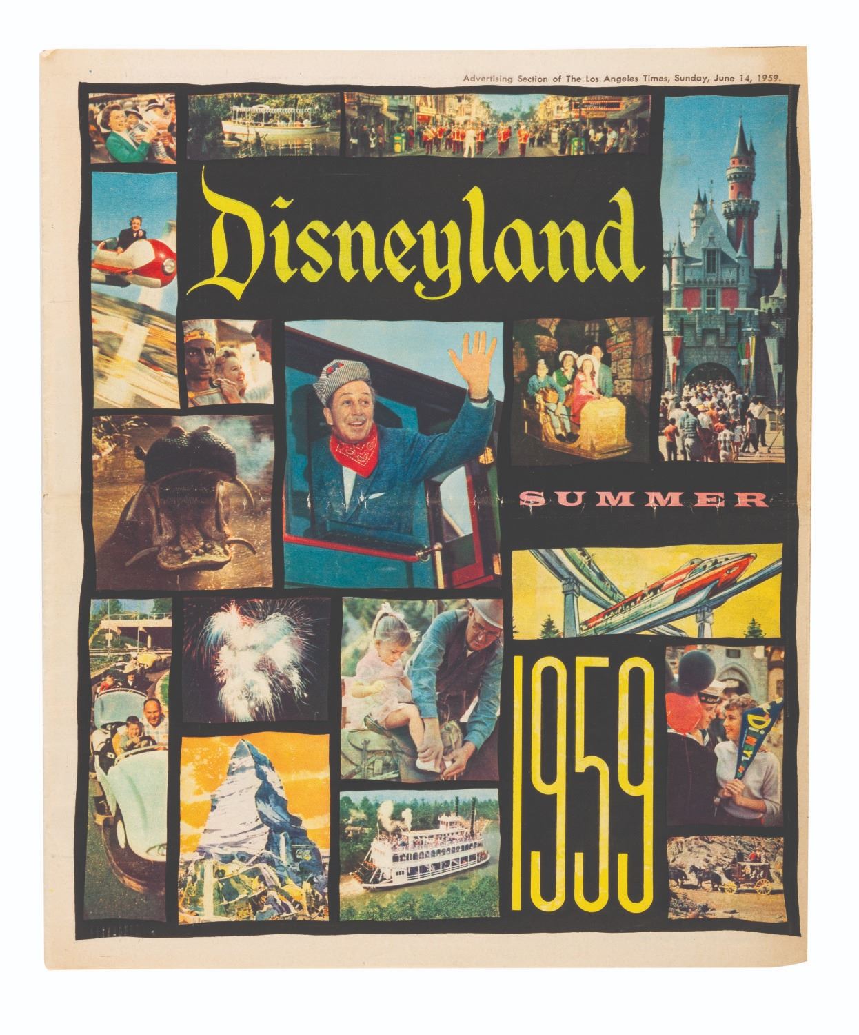 (Disneyland, 1959) A full color Disneyland advertising supplement from the Sunday Los Angeles Times on June 14, 1959. The 24 pages of photos and concept art show the new attractions coming to Disneyland in its 1959 expansion including the Matterhorn Bobsleds, Subway Voyage, and Disneyland-Alweg monorail system. Measuring 10.75"x12.75", the supplement is in very good condition, exhibiting some creasing along the spine and edges consistent with handling.