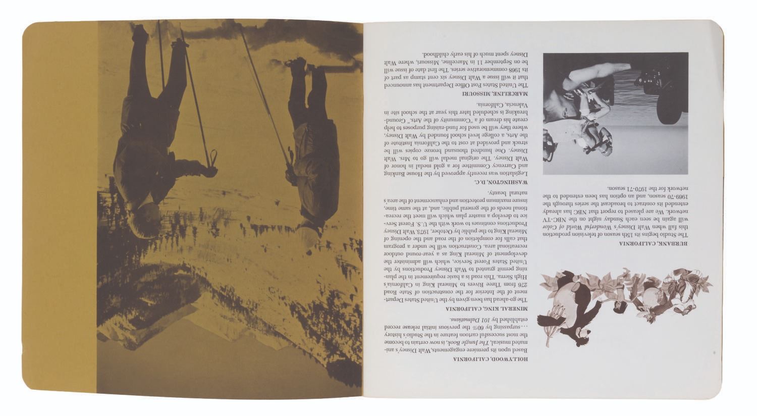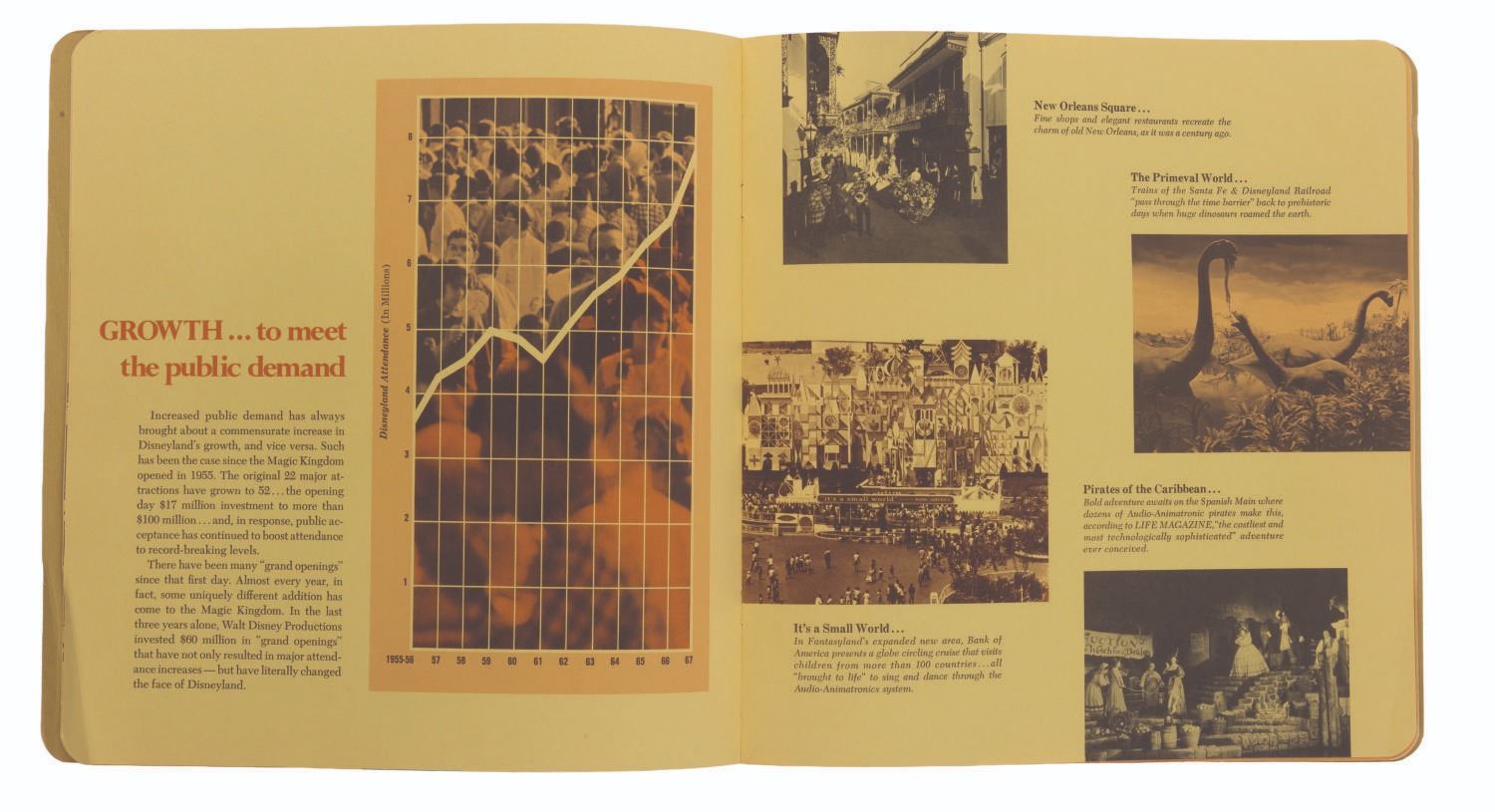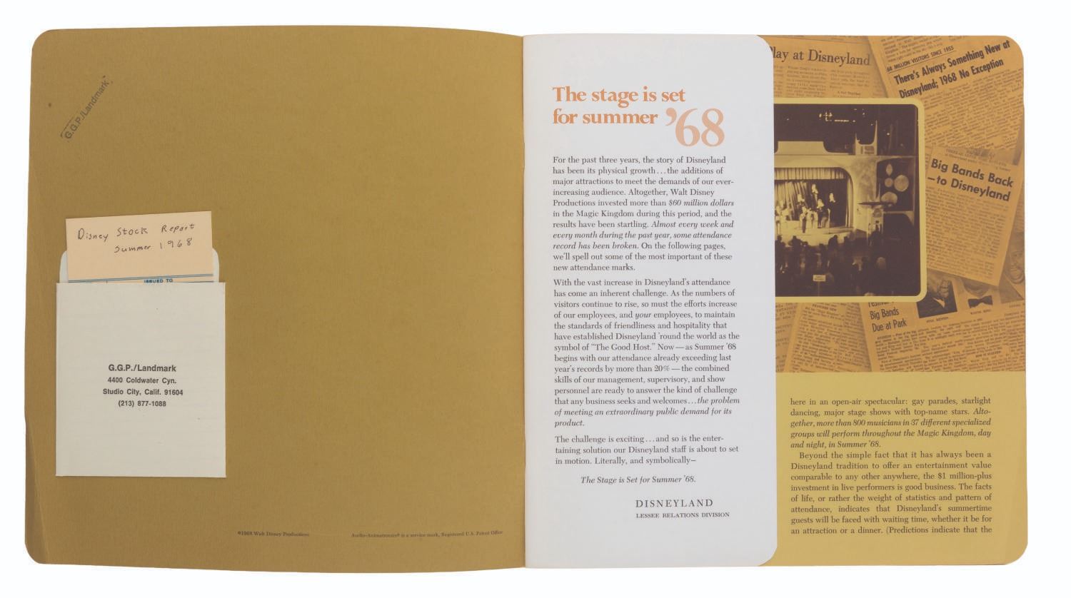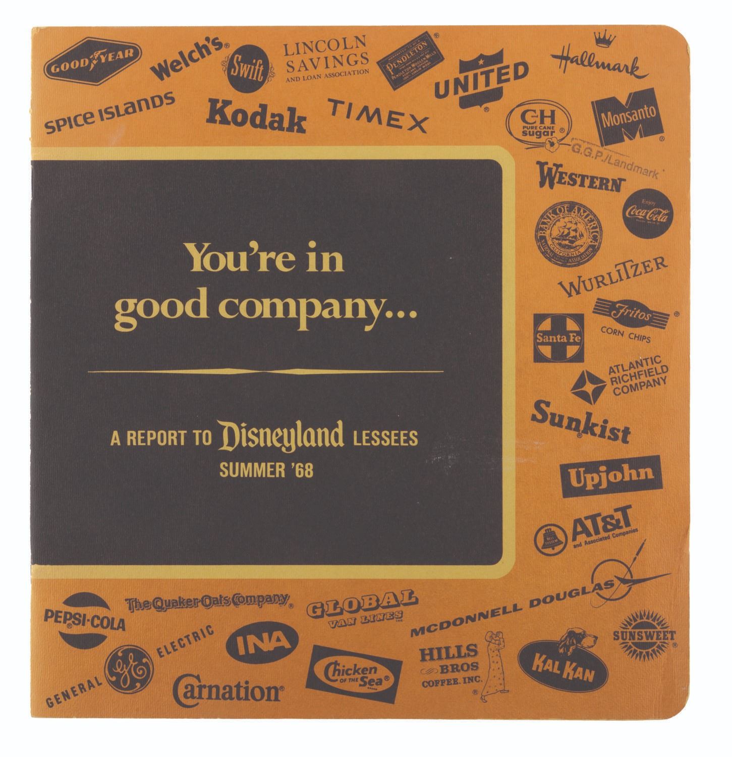 (Disneyland, 1968) A Report to Disneyland Lessees for the Summer of 1968. The report contains information of interest to partner companies, such as attendance records, recent additions to the Park, lessee testimonials, marketing partnership ideas, Club 33 for VIPs, and plans for the upcoming Walt Disney World. Measuring 10" x 10.5", the report is in very good condition with creasing along the right edge, rubber stand marks, and a library card from previous circulation.