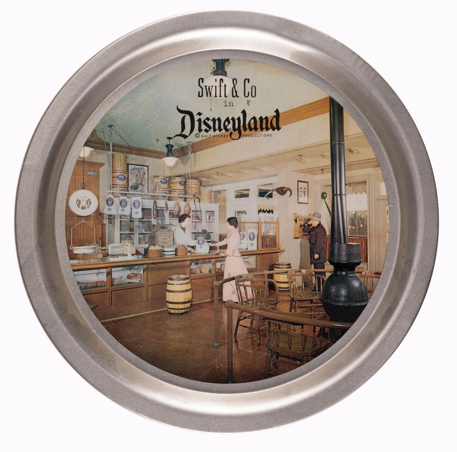 (Disneyland, 1955-60s) A rare Swift's & Co. souvenir aluminum tray from Disneyland. Measuring 11.25" in diameter, the tray is in good condition with a few scuffs and light wear, mostly to the reverse.