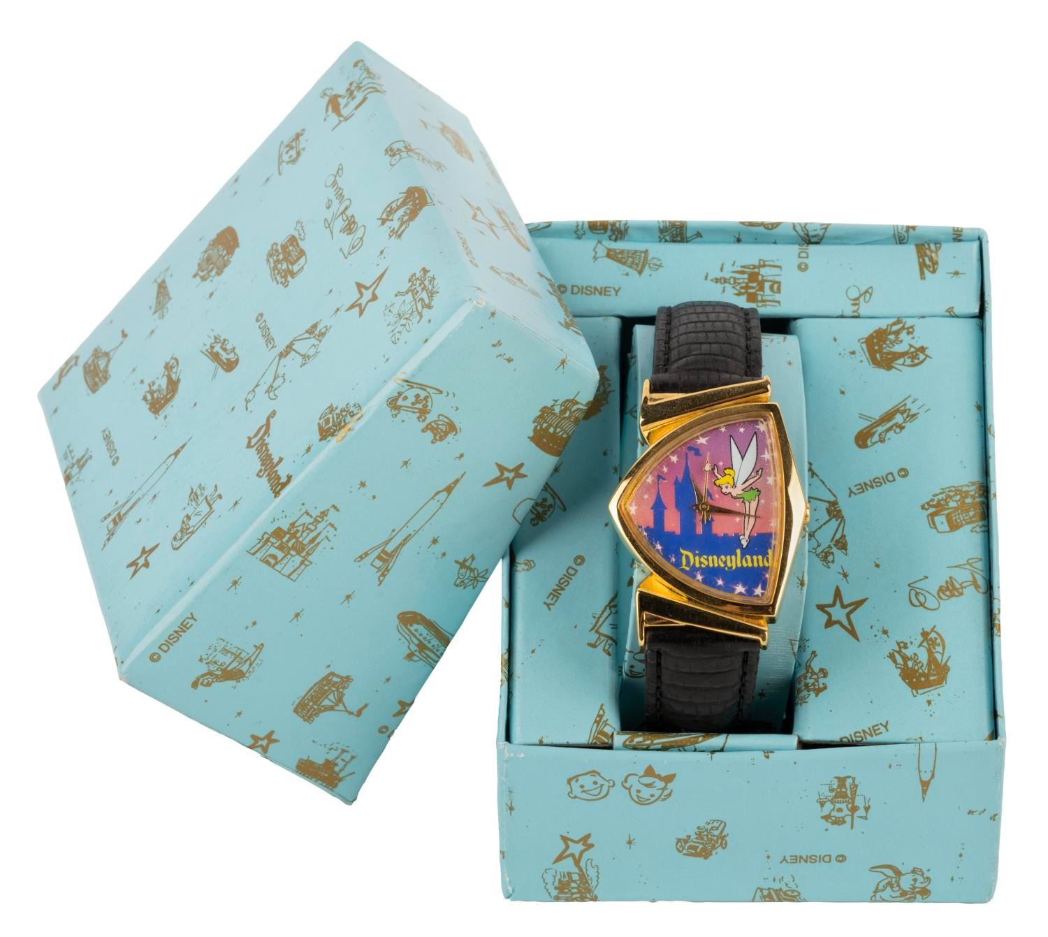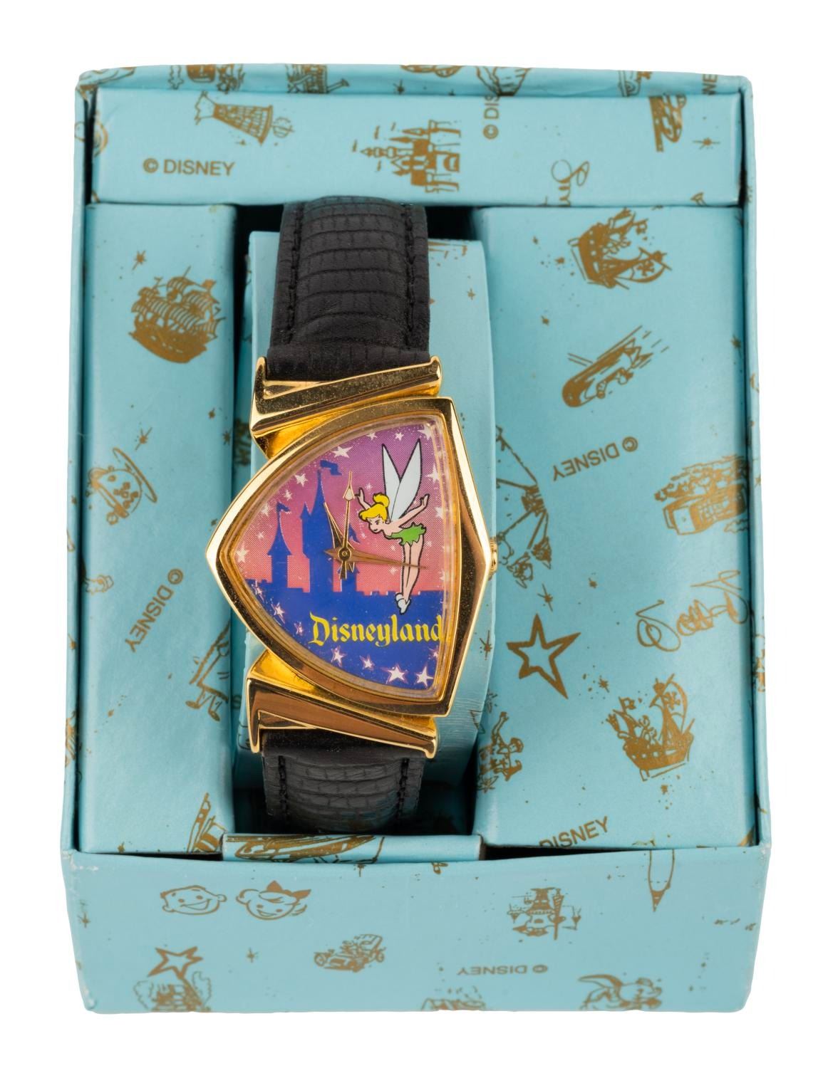 (Disneyland, 1995) A Cast-exclusive watch in honor of the 40th anniversary of Disneyland and Team Pride. This wristwatch has Tinker Bell over Sleeping Beauty Castle on its face and the back is engraved: "Team Pride 95, Limited Edition 0088/3000, July 17, 1995, Disneyland." This watch comes in its original 3"x3"x3" box and is in very good condition exhibiting a few faint scuffs.