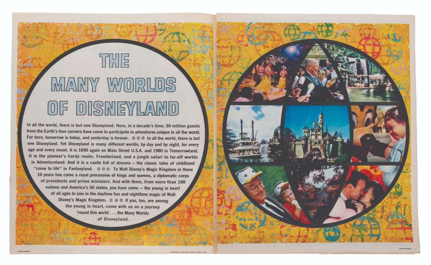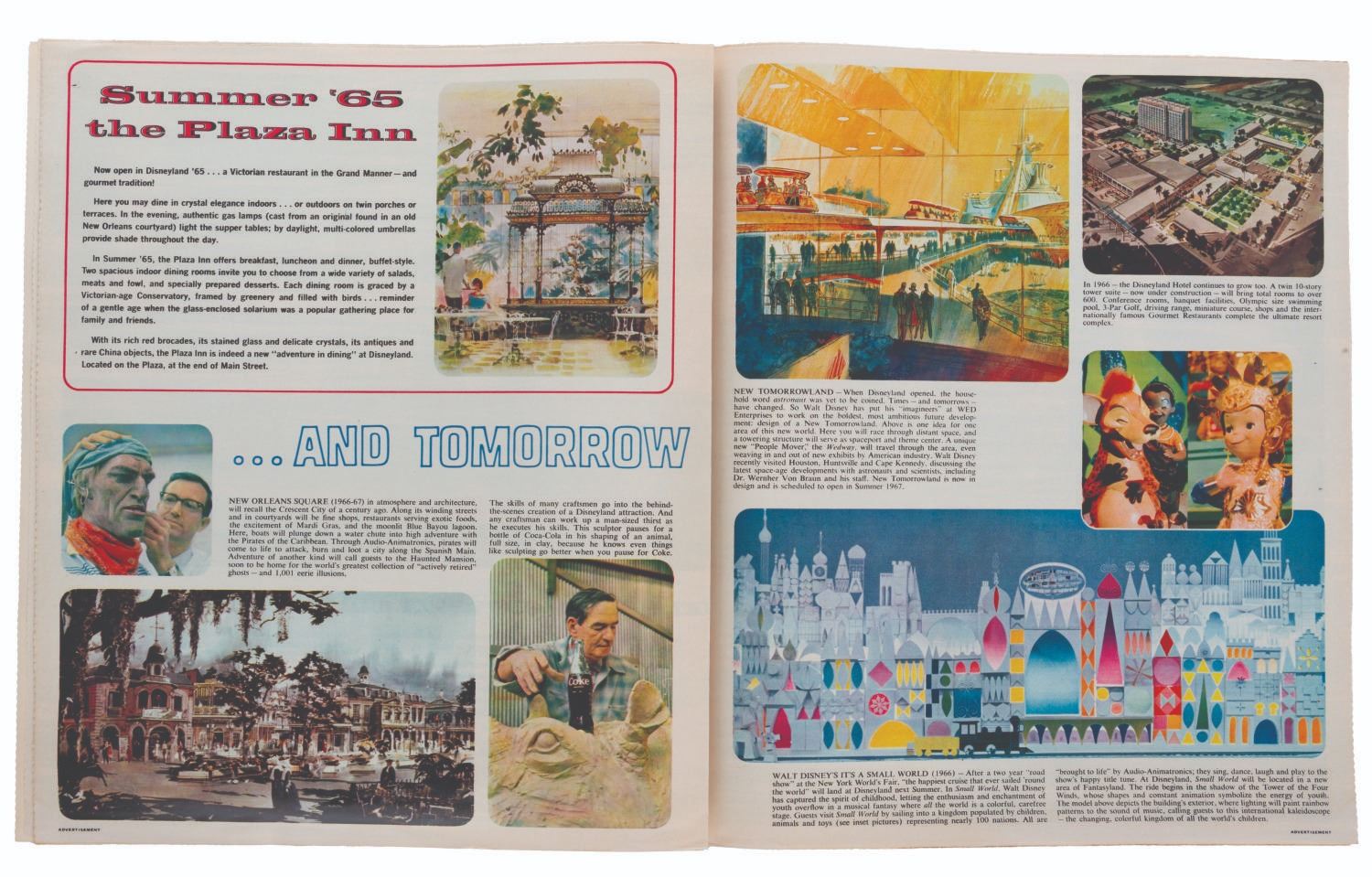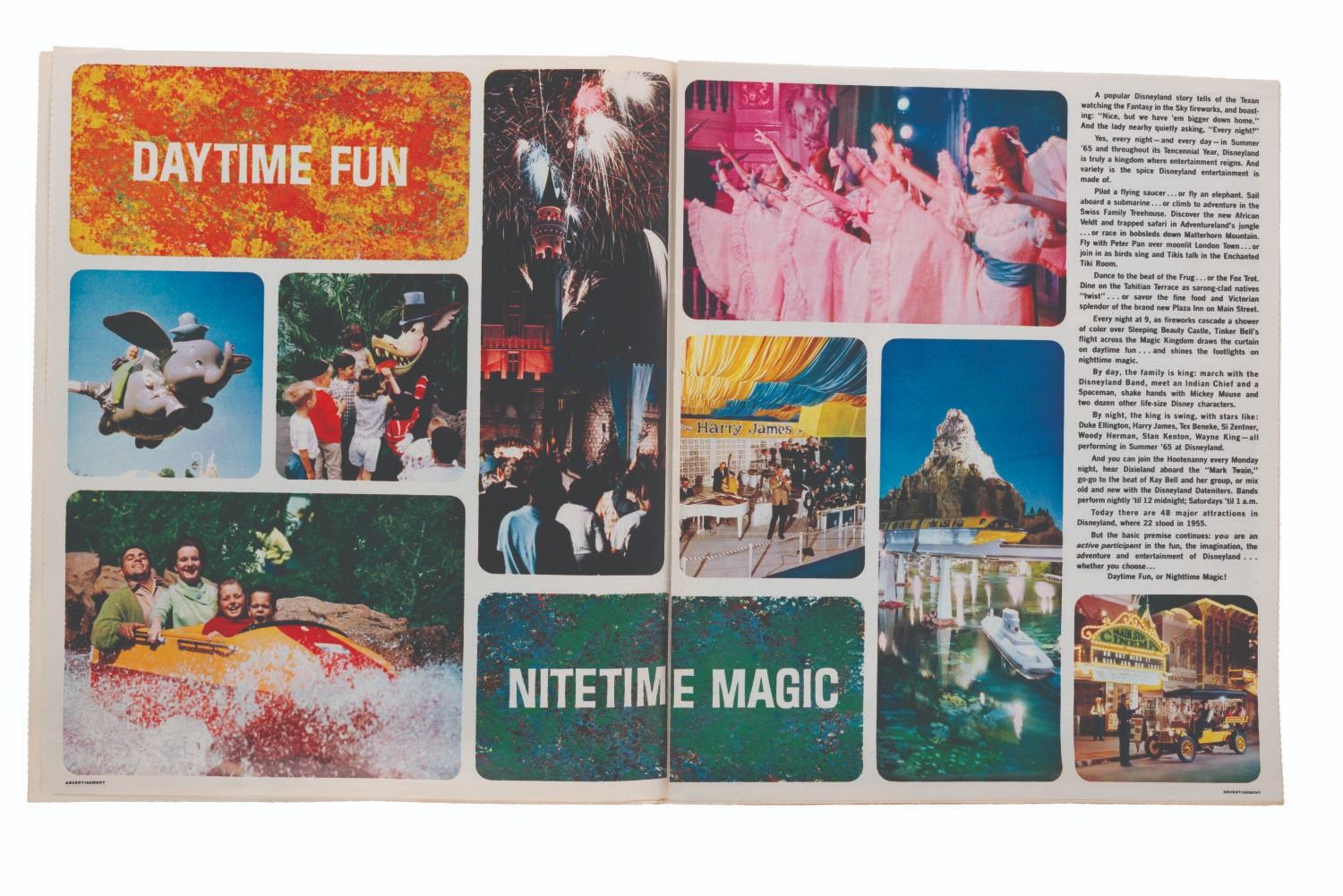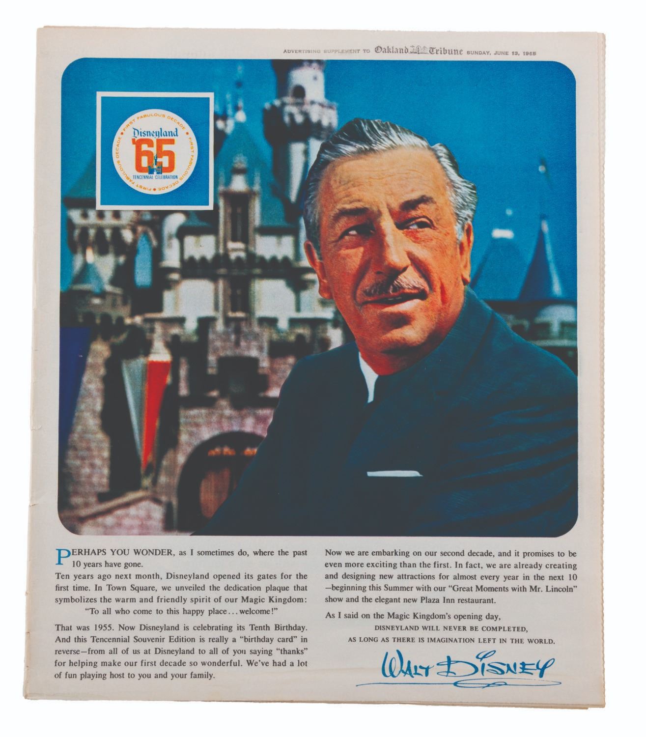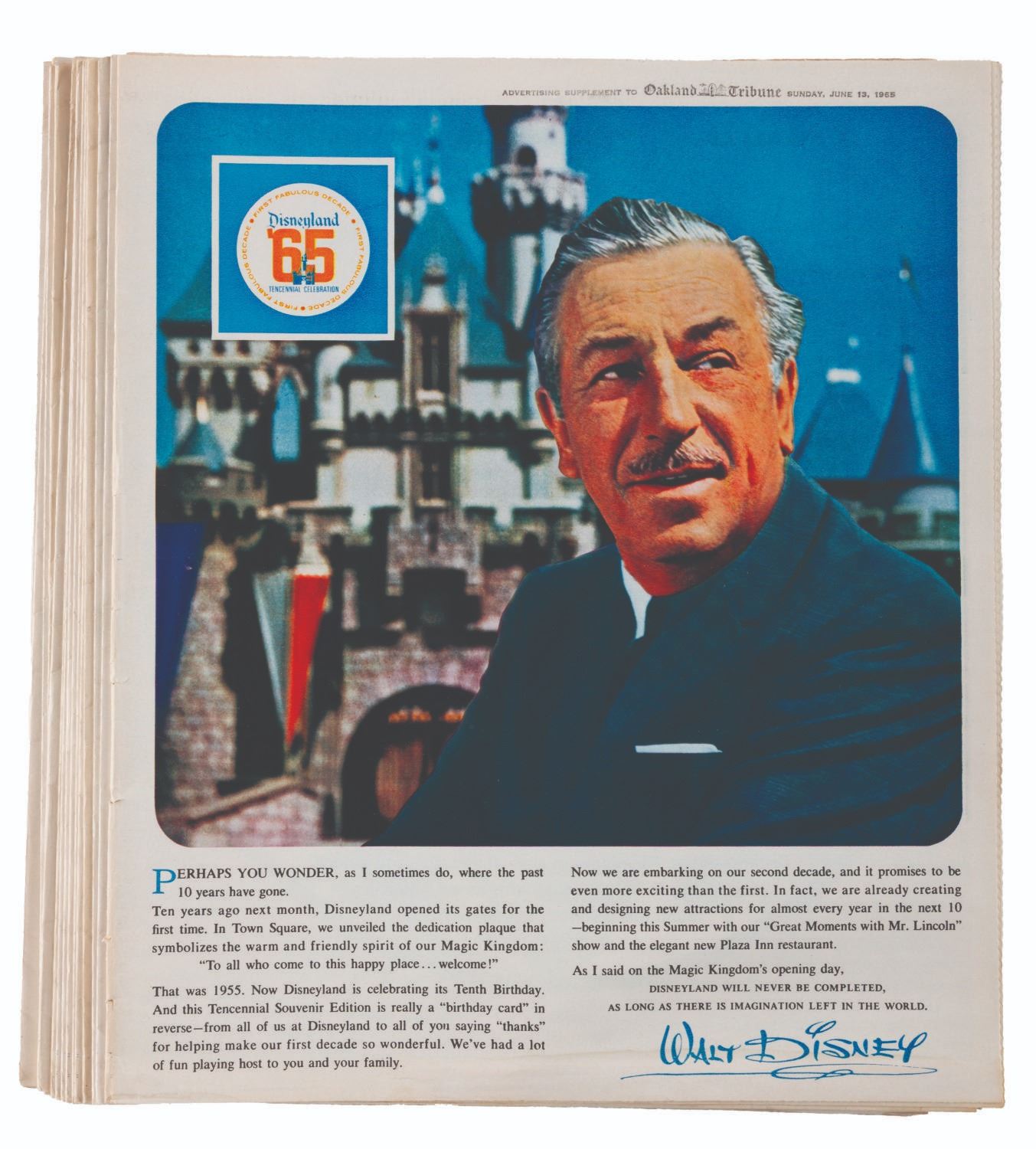 (Disneyland, 1965) A collection of 14 newspaper supplements from the Oakland Tribune commemorating Disneyland's 10th anniversary, with a history of the Park and full-color photos. Each 20-page supplement measures 11" x 13", all in good to very good condition, many with faint wear from water exposure along the very bottom edge.