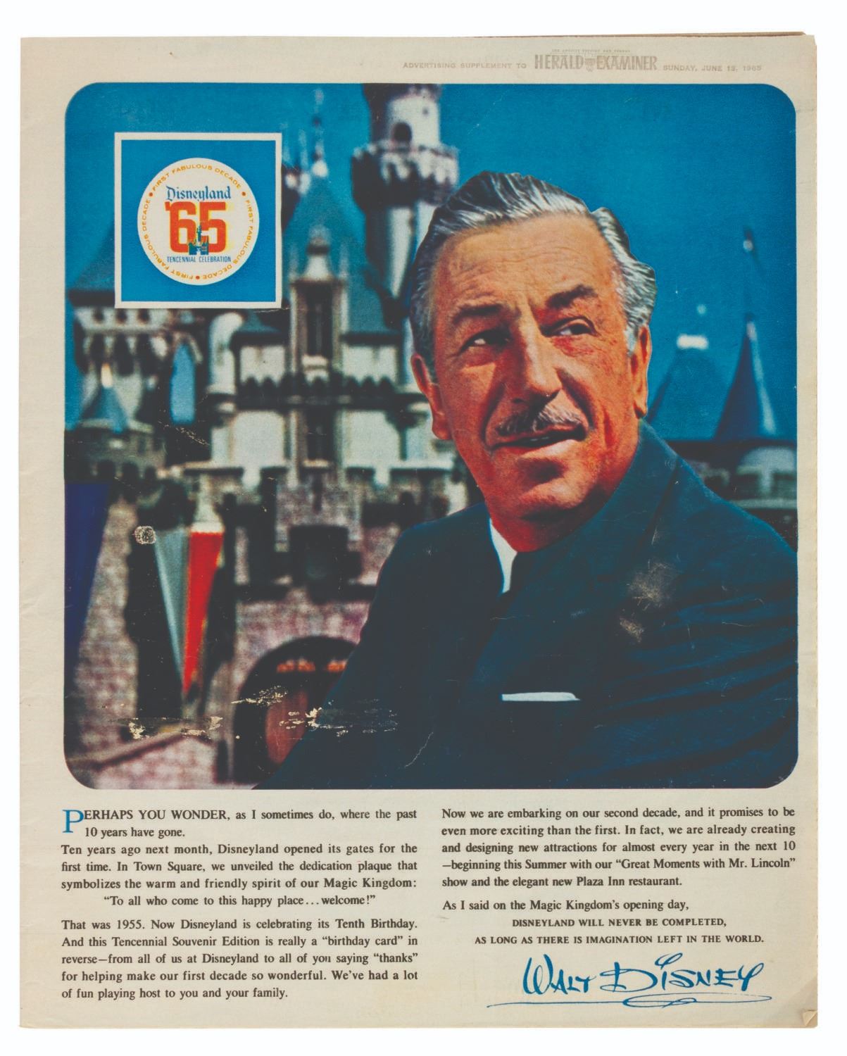 (Disneyland, 1965) A newspaper supplement commemorating Disneyland's 10th anniversary with a history of the Park and full-color photos. Measuring 11” x 13”, the 11-page supplement is in very good condition with minor wear from handling.