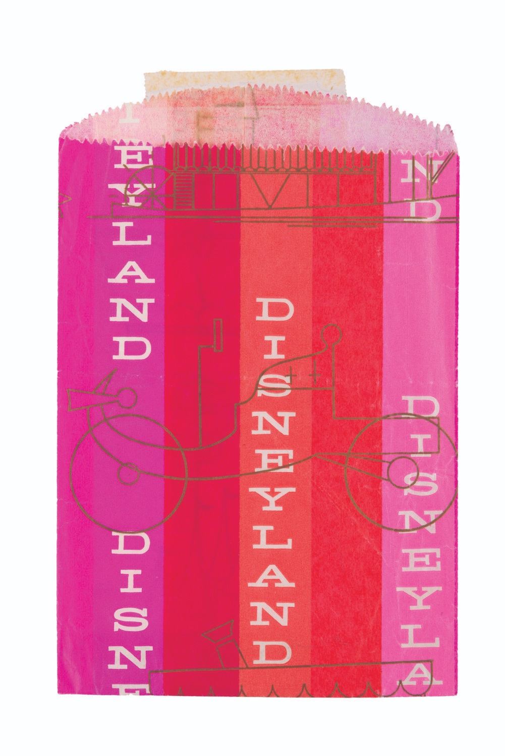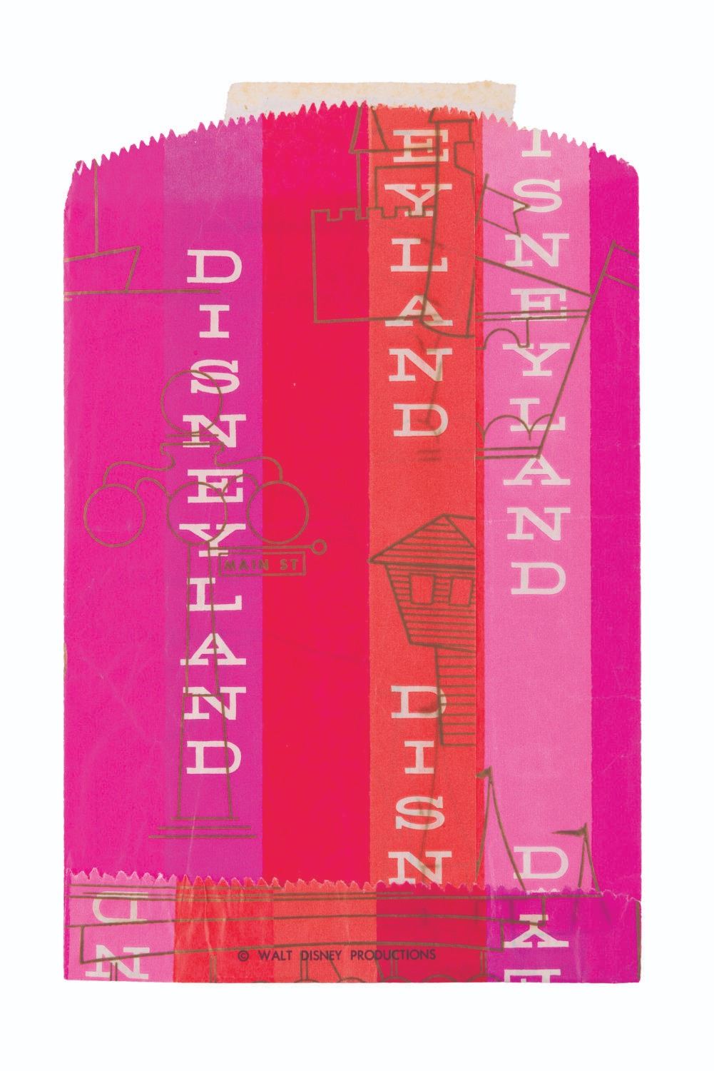 (Disneyland, 1965) A Disneyland merchandise bag from the Tencennial. Measuring 5.5 " x 8 ", the paper bag is in good condition with creases throughout, a full horizontal fold at the center, and tape at the top.