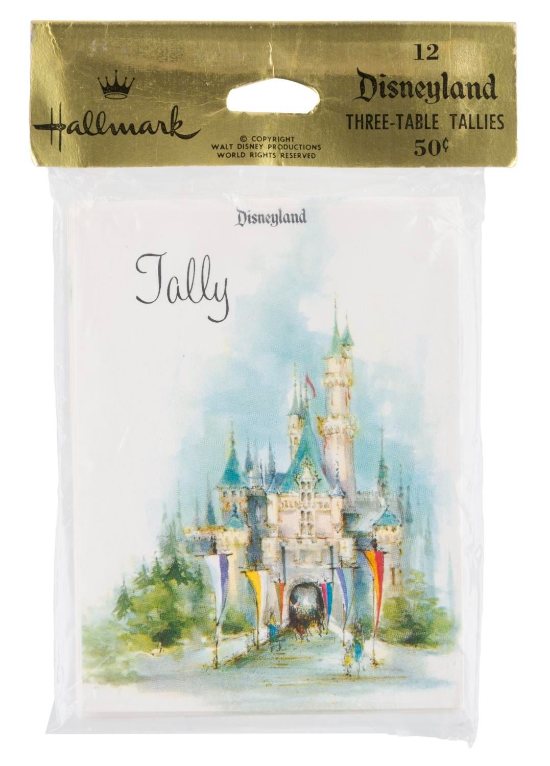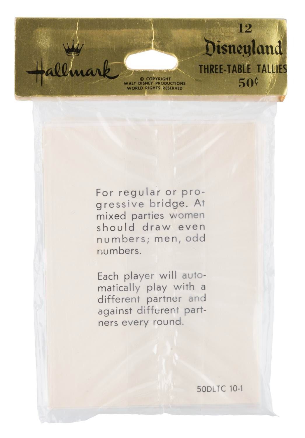 (Hallmark, 1961) A pack of 12 Disneyland three-table bridge tallies featuring Sleeping Beauty Castle from the Hallmark Communication Center on Main Street, U.S.A. Measuring 2.75” x 3.5”, the tallies are in fine condition inside the 3.75” x 5” opened bag, in good condition with creasing.