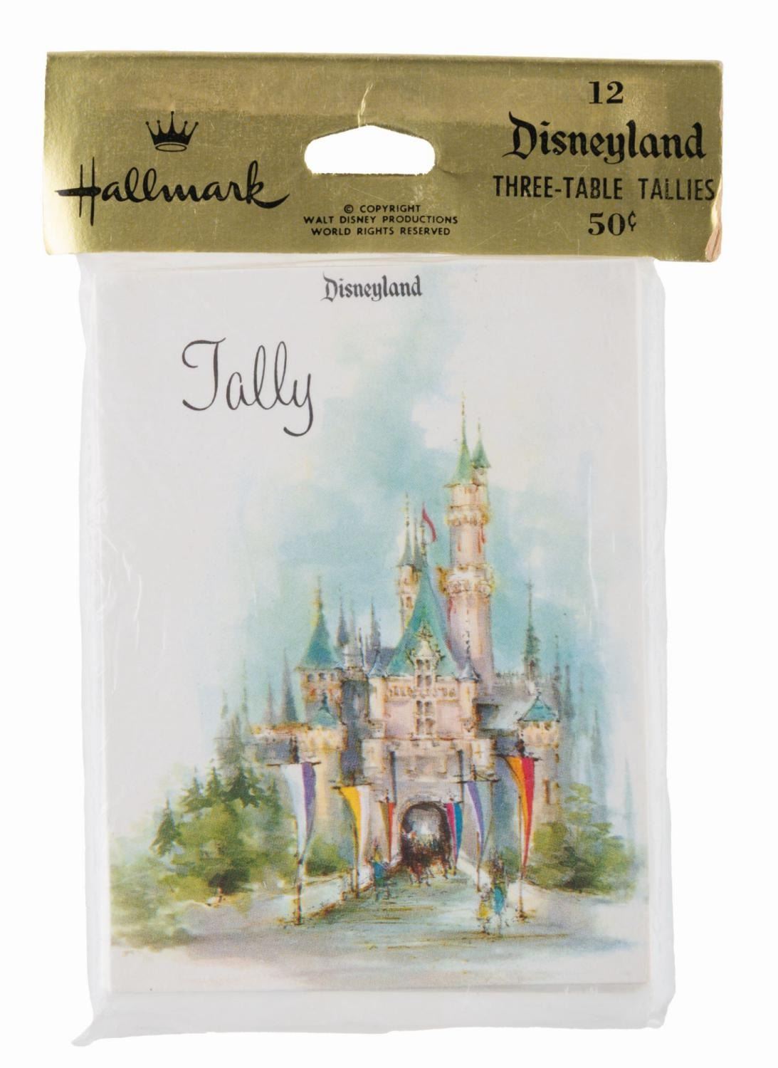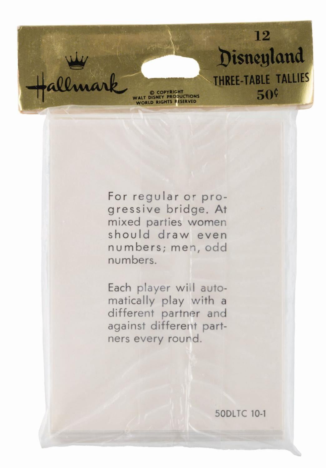 (Hallmark, 1961) A pack of 12 Disneyland three-table bridge tallies featuring Sleeping Beauty Castle from the Hallmark Communication Center on Main Street, U.S.A. Measuring 3.5" x 5", the tallies are in very good, unused condition with light wear to the original packaging.