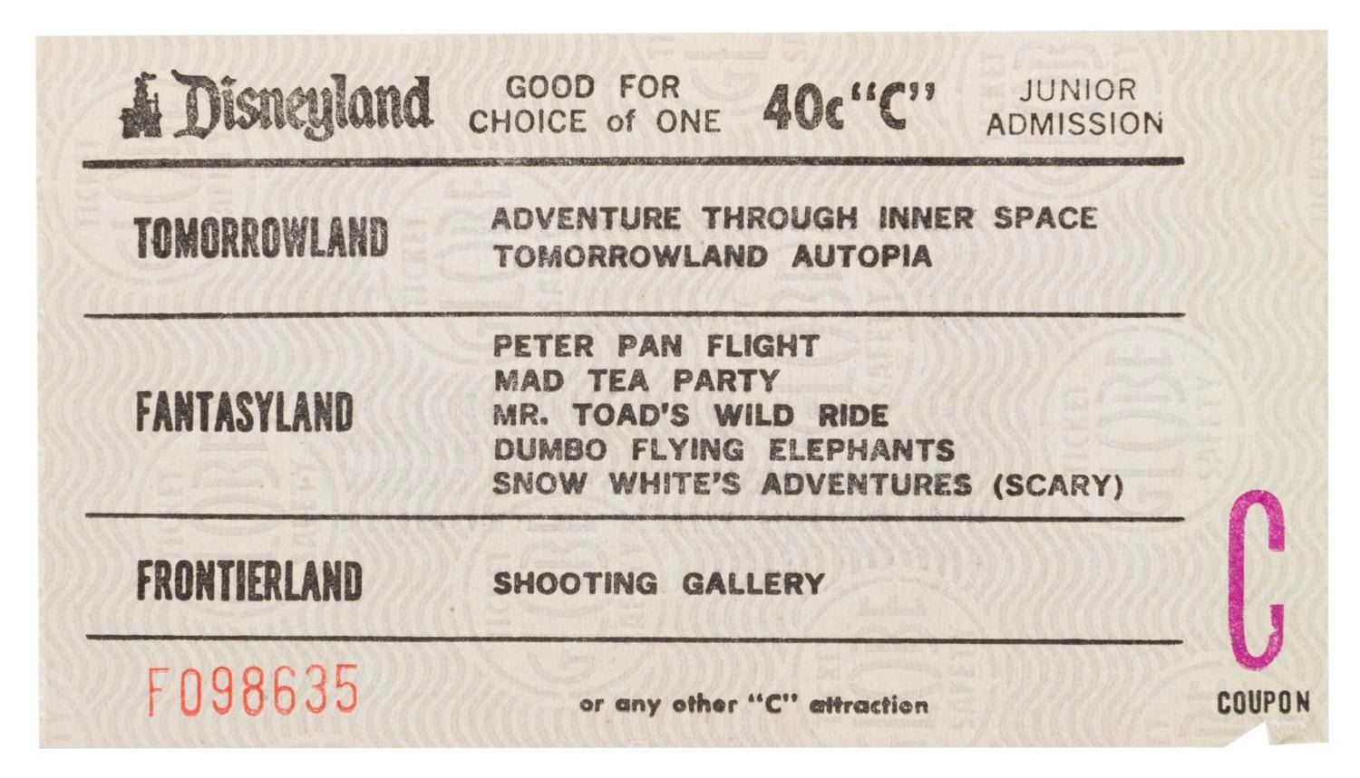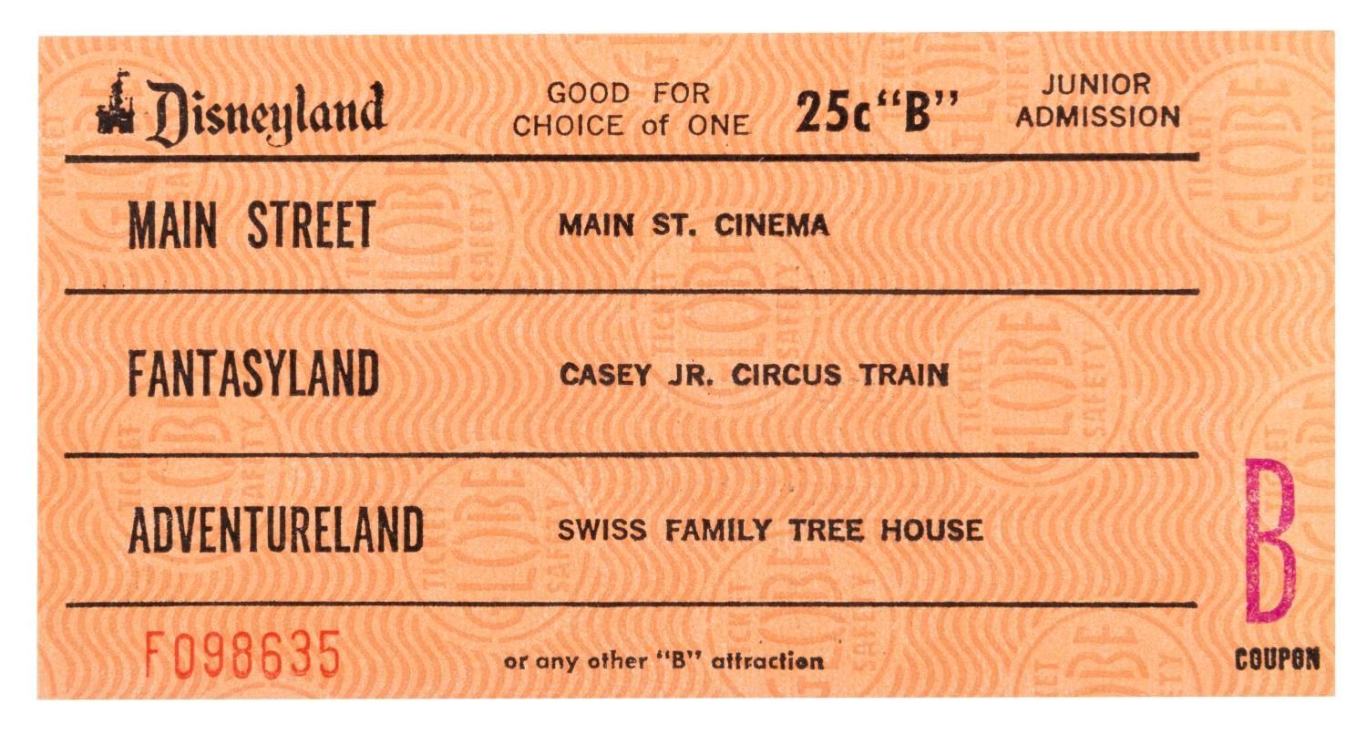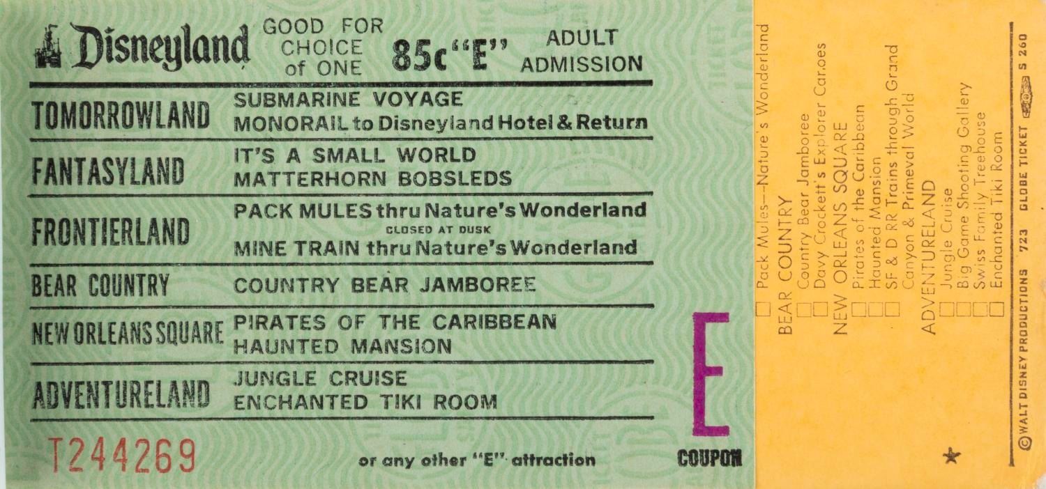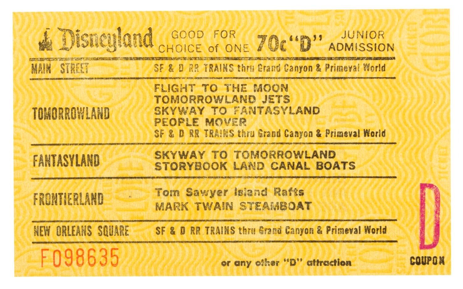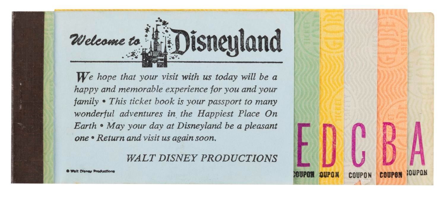 (Disneyland, 1973) An original Disneyland adult ticket book from 1973, with a missing cover. The book includes the Welcome to Disneyland tab and one each of"A,”"B,”"C,”"D,” and"E” tickets. Measuring 2.5” x 6”, the ticket book is in fair condition with wear, and all tickets except the"E” and Welcome tab detached.