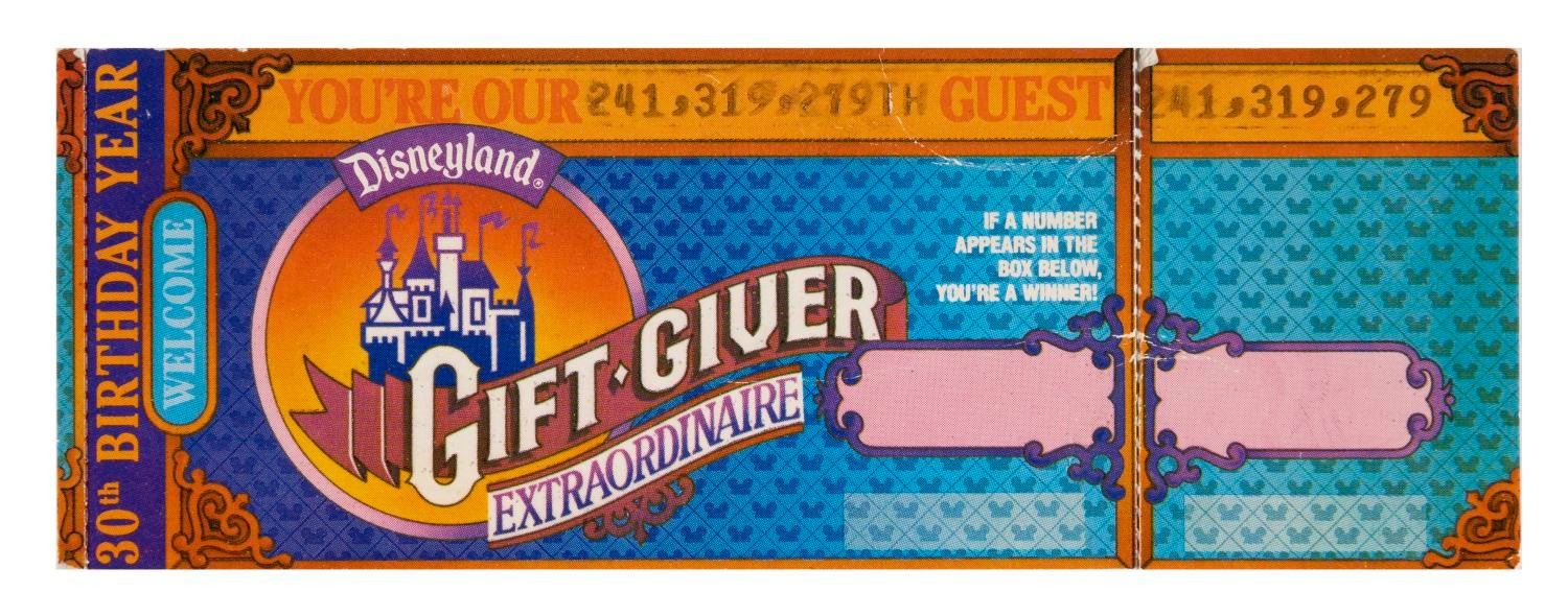 (Disneyland, 1985-98) A collection of tickets and bookmarks from Disneyland included are bookmarks celebrating events from the 30th year, a complete set of 24 Dream Machine tickets, a Gift Giver Extraordinaire ticket, and a 1998 Disneyland “Forever” ticket. Measuring 8.5” x 2.5” and 5.5” x 2”, the tickets and bookmarks are in very good condition, exhibiting expected wear, and the Gift Giver ticket retaining its detached stub.
