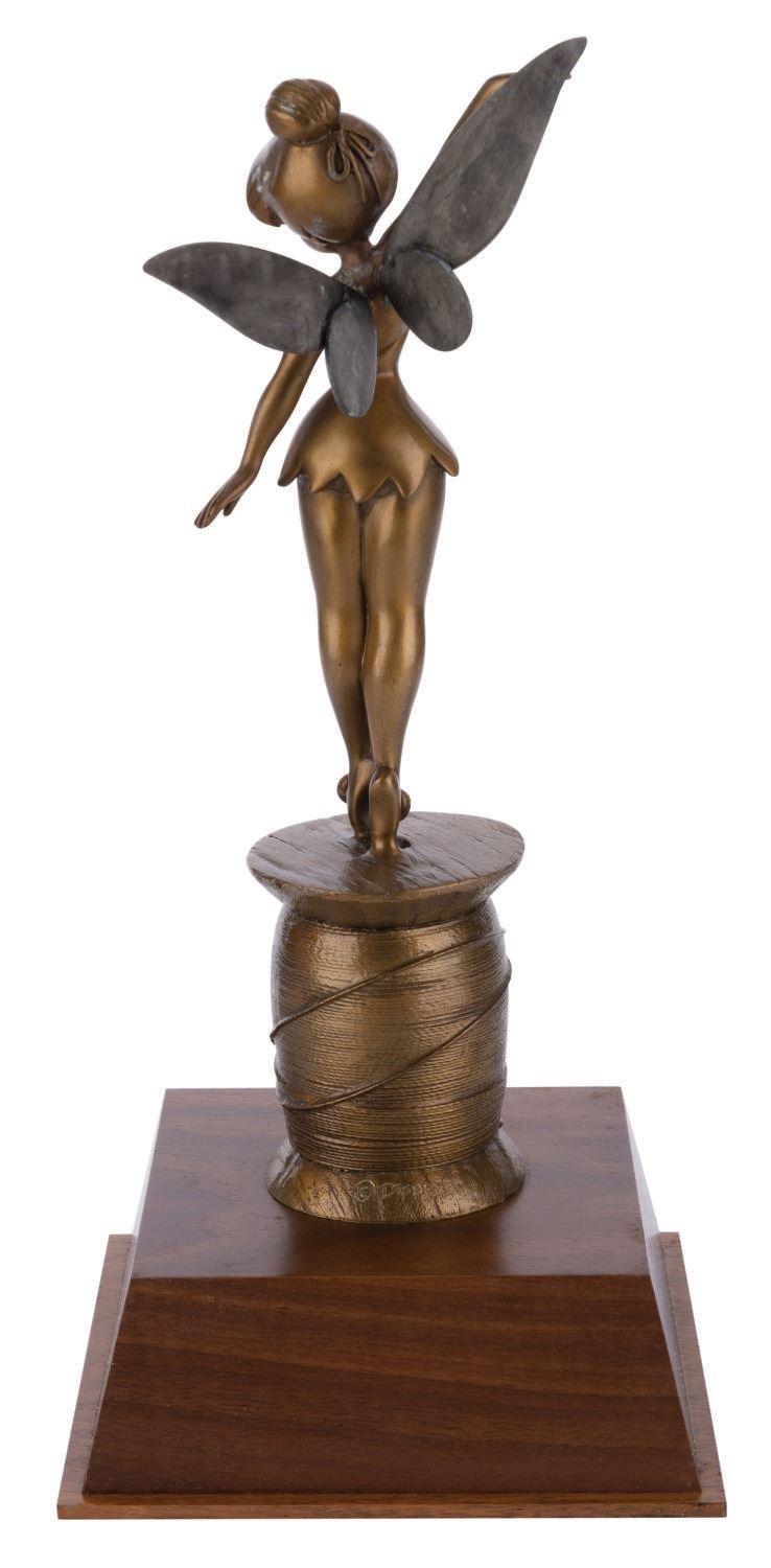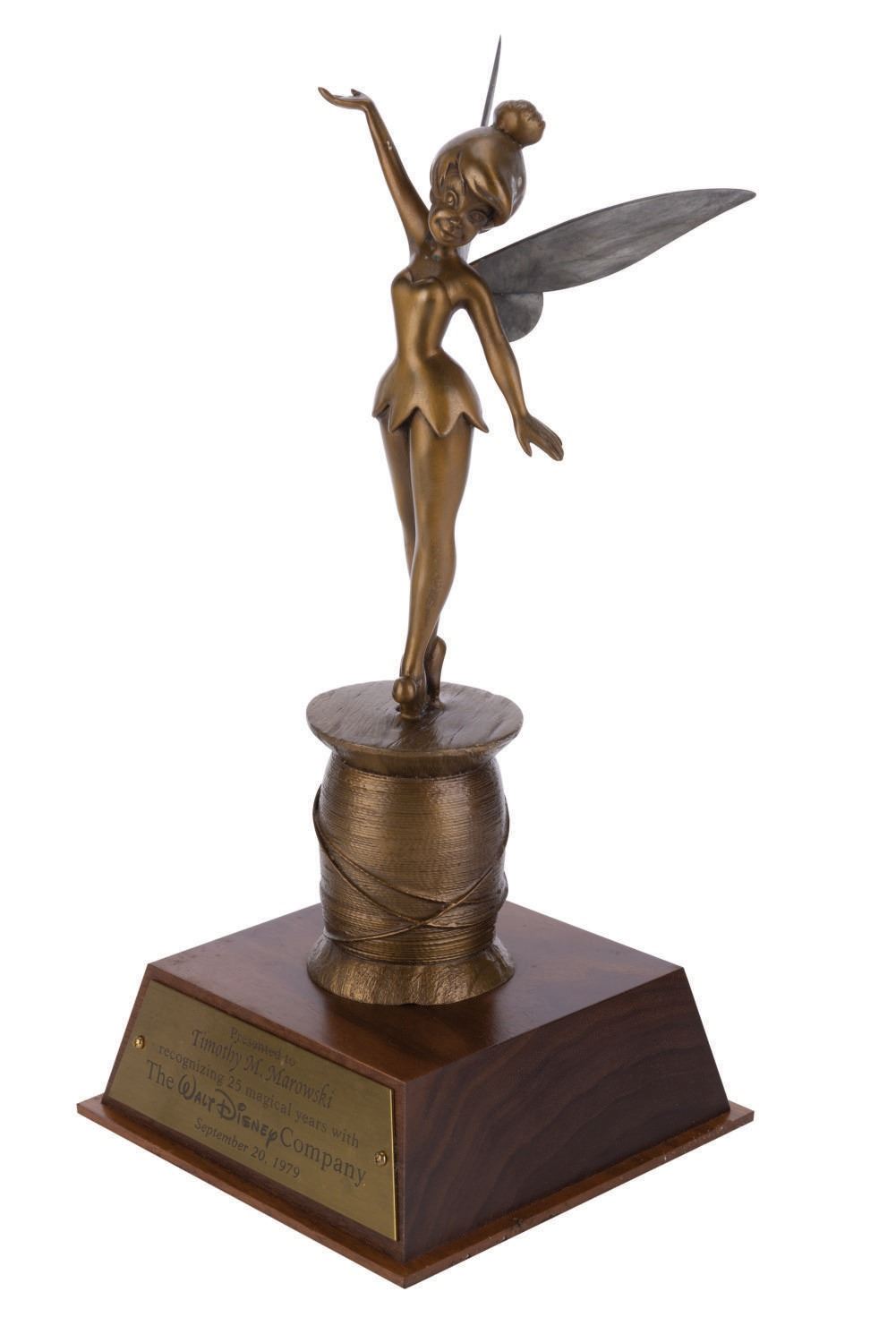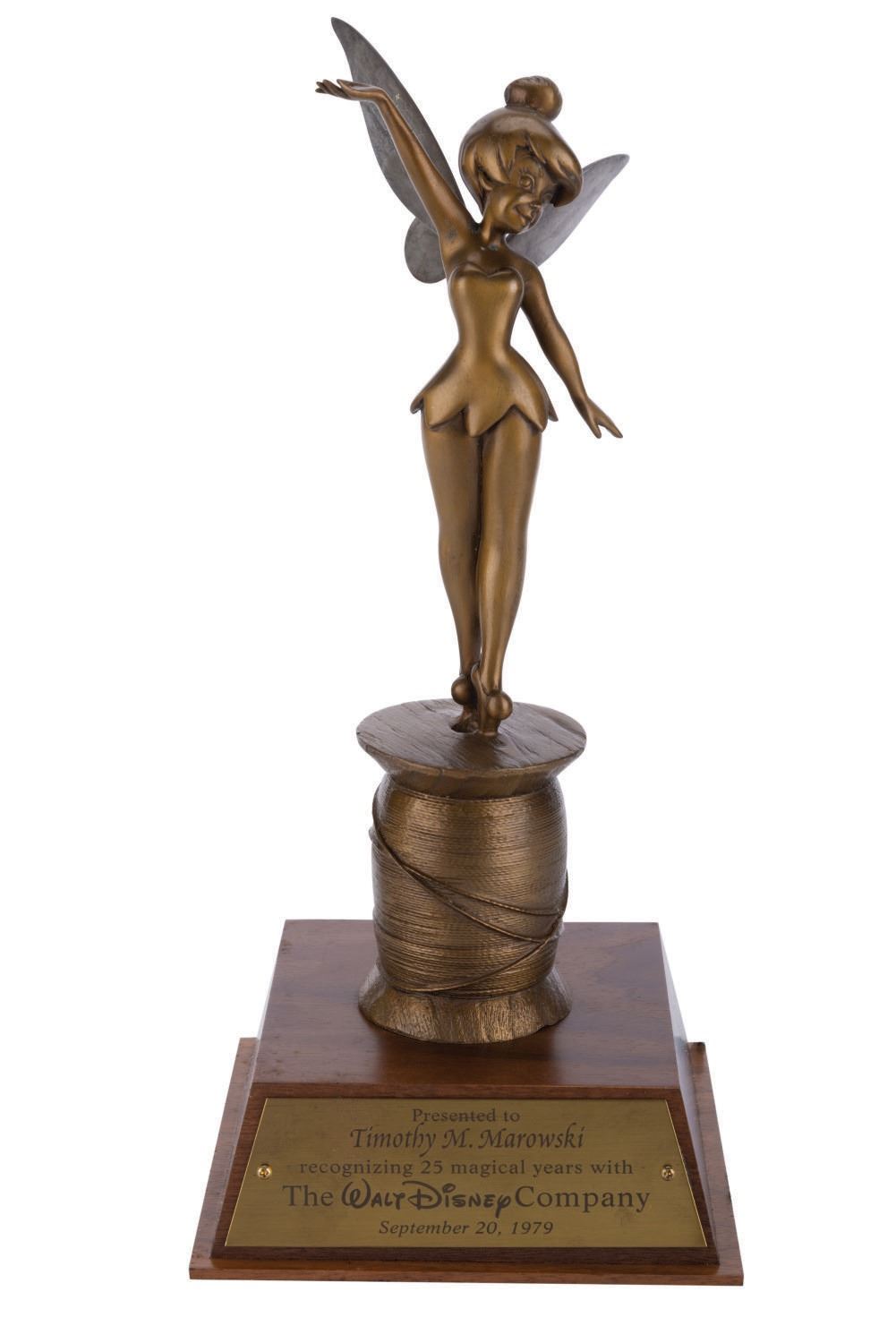 (Disneyland, 1979) A 25-year Cast Member service award. This edition of the award features a bronze Tinker Bell attached to a wooden base with a custom engraved plaque recognizing "25 magical years" of service to the Disney Organization. Few Cast Members make it to this milestone year, making this edition of the Service Award very rare. Measuring 13" tall the piece is in good condition with areas of light oxidation, and minor wear from display.