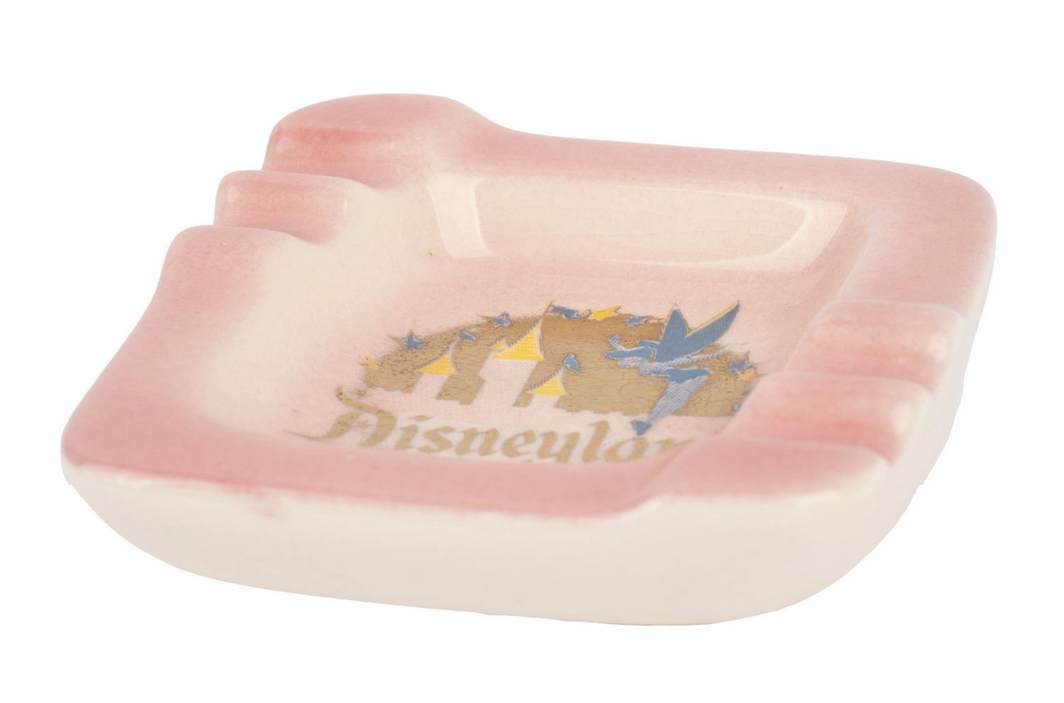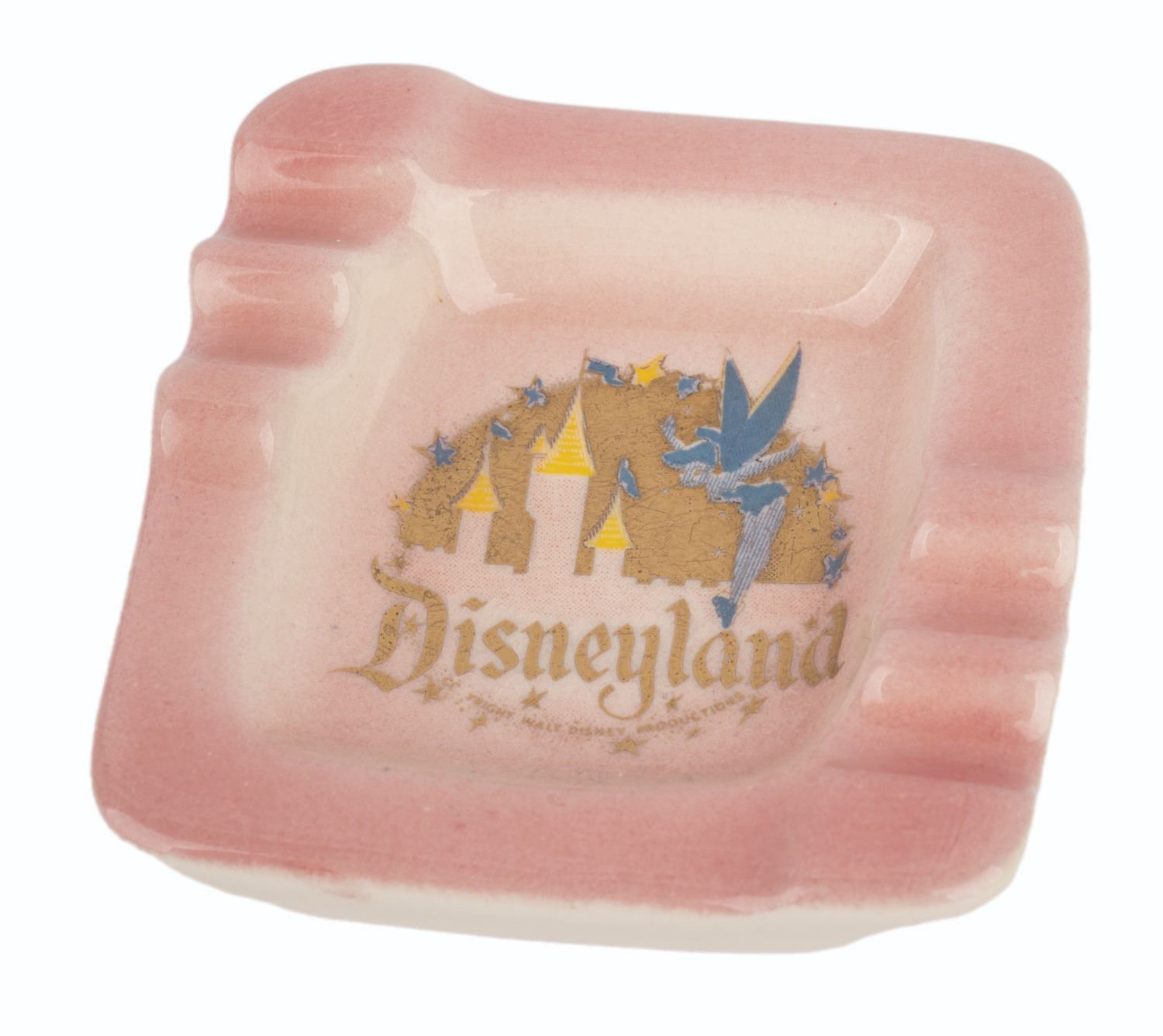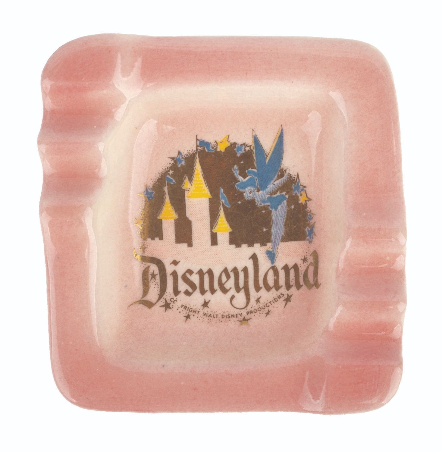 (Welborn, 1955-60s) An extremely rare small souvenir ashtray depicting the Sleeping Beauty Castle and Tinker Bell logo of Disneyland. The two-toned vignette of the Fantasyland icons is accented with gold-finish, centered within a glazed ceramic ashtray. This piece was made exclusively for Disneyland by local Monterey artists at Eleanor Welborn Art Productions. Measuring 4"x4", this souvenir of Disneyland displays in very good condition with crazing and wear throughout.