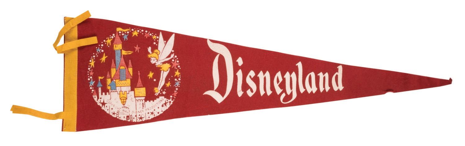 (Disneyland, 1955) A charming early Disneyland souvenir red pennant. The felt pennant features screen printed graphics of the classic Disneyland text logo and large image of Tinker Bell flying over Sleeping Beauty Castle. This pennant features a variation of the screen-printed copyright. Measuring 27" long, the souvenir is in good condition with softening from age, creases to steamers, a curl to its finest point, and minor surface wear.