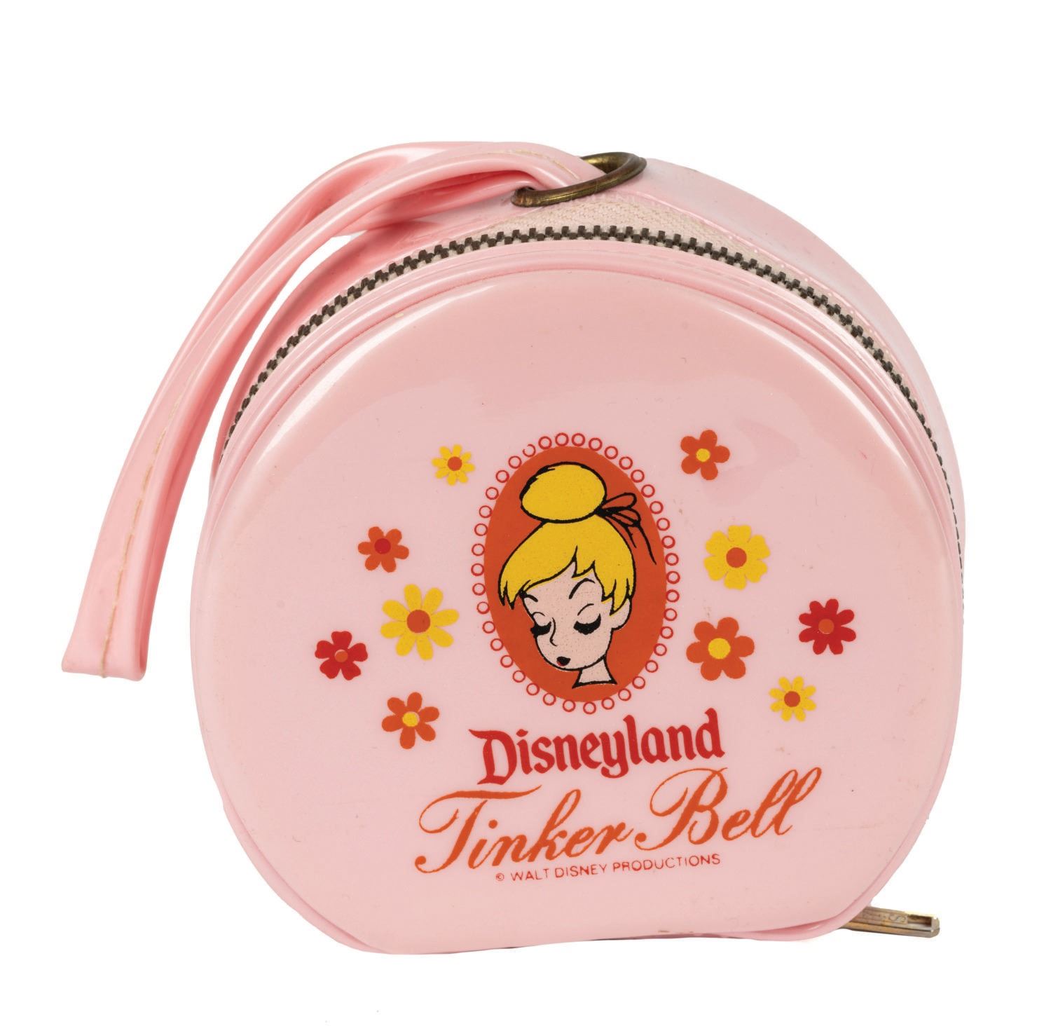 (Disneyland, 1960s) A Disneyland Tinker Bell Change Purse. The small pink vinyl canteen bag purse has an 8" wristlet strap and features a colorful printed cameo of Tinker Bell and the Disneyland name. Measuring 3.75" in diameter, the purse is in very good condition with a few light scuffs and light wear.
