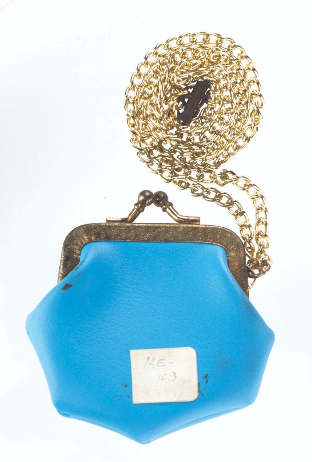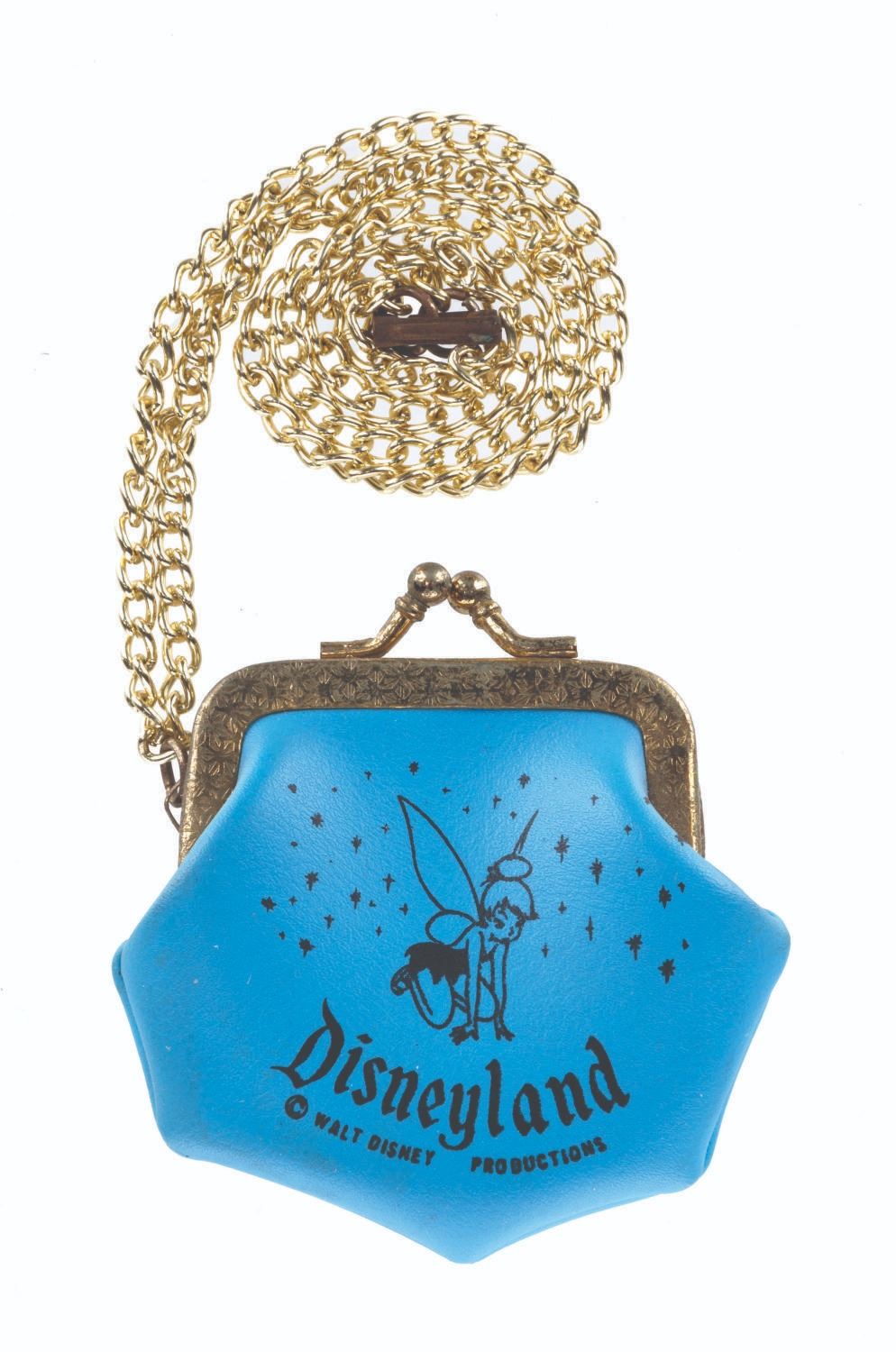 (Disneyland, 1950s-60s) A souvenir Disneyland coin purse featuring Tinker Bell. The vinyl coin purse has metal clasps, a ball chain, and reads"Disneyland.” Measuring 3” x 3” with an 11.5” chain, the coin purse is in very good condition with light oxidation and wear.
