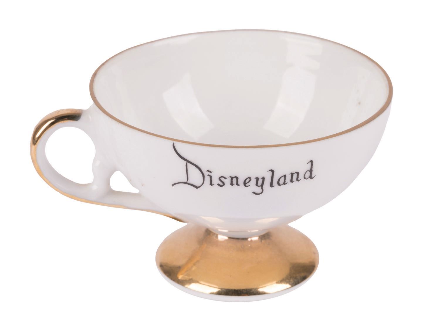 (Disneyland, 1950s) A small teacup souvenir of Disneyland, featuring both Disneyland's ambassador Tinker Bell and the iconic Sleeping Beauty Castle. The dish measures 4.5" in diameter and the cup is 1.75" tall and 2.75" in diameter, each piece in very good condition with only light wear.
