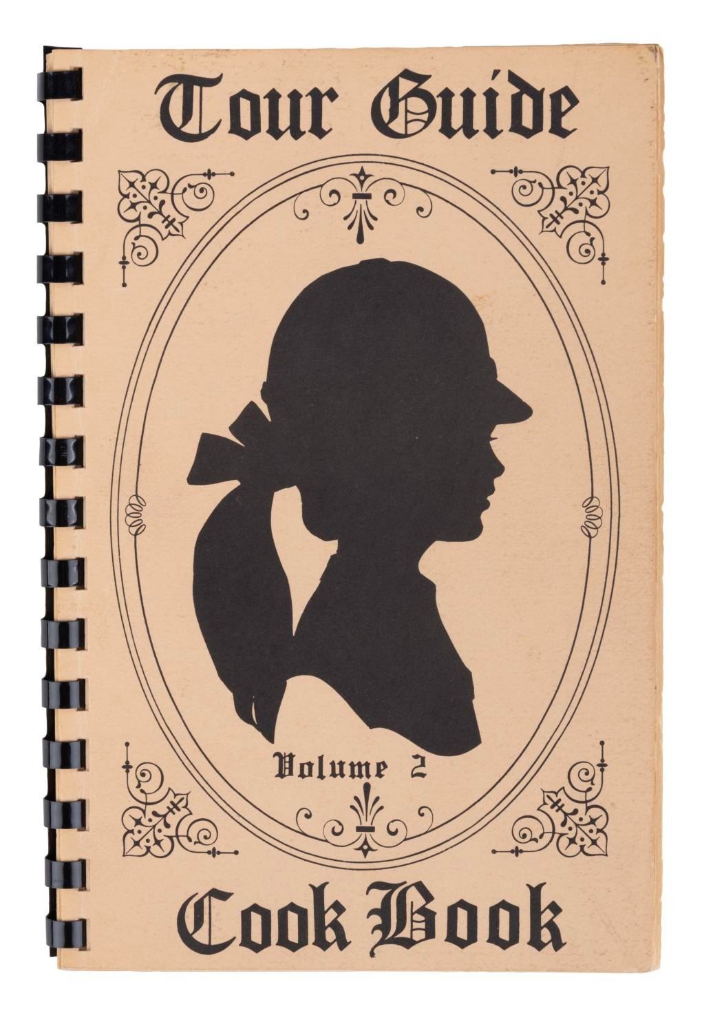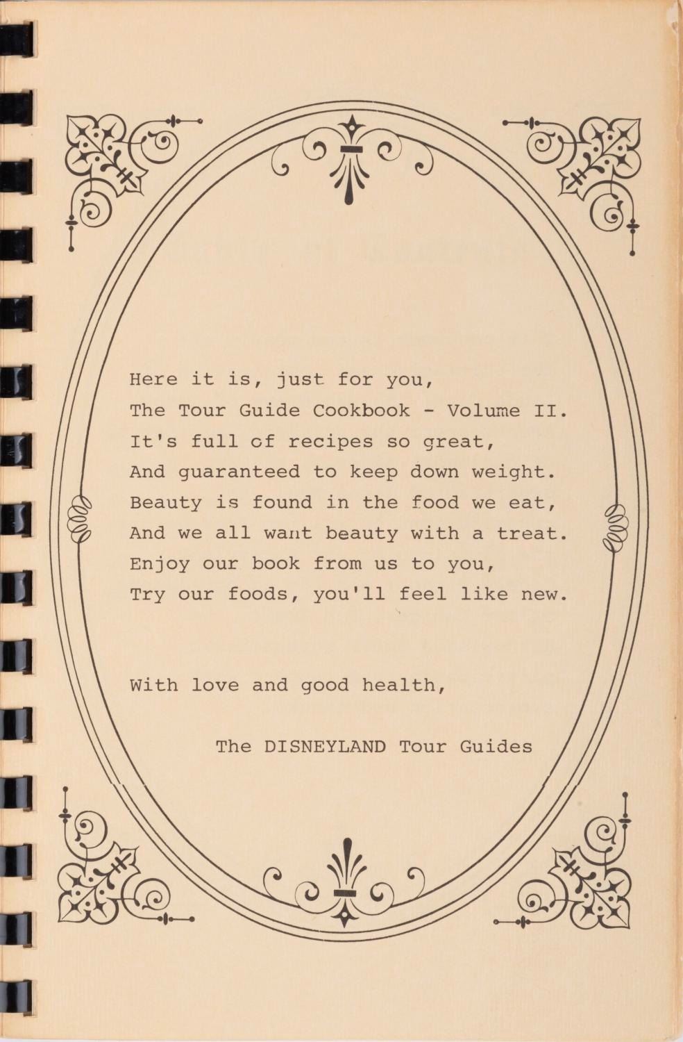(Disneyland, 1970s-80s) A "Disneyland Tour Guide Cook Book Volume 2" featuring 72 pages of recipes contributed by Disneyland Tour Guides. Measuring 5.75"x8.5", this spiral-bound book is in good condition with scuffs and wear.