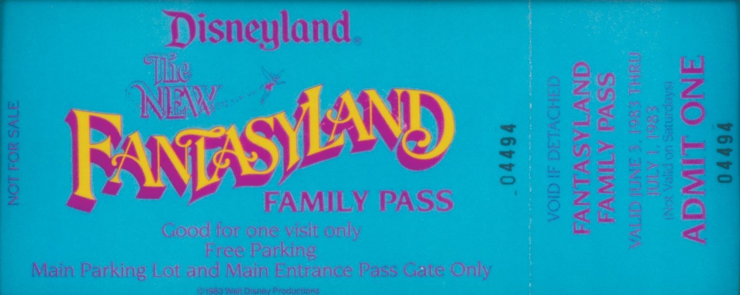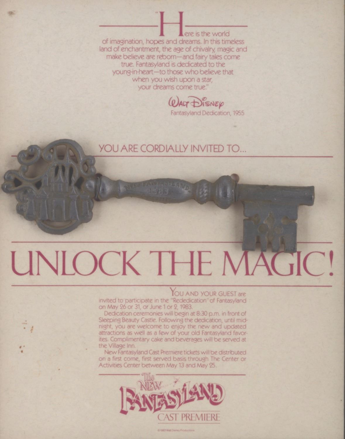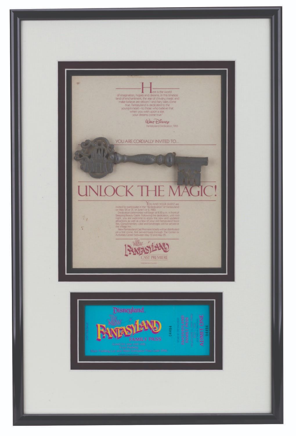 (Disneyland, 1983) An original cast member key with an invitation and a Family Admission pass for the Re-Dedication of Fantasyland in 1983. The key is engraved with "New Fantasyland 1983 Opening" and is affixed to the invitation. The key measures 6.25" long, the invitation 7.5” x 9.25” and the ticket is 2.5"x6". This set is in very good condition with some spotting to the invitation, all presented in a 12.75” x 19.5” matte and frame.