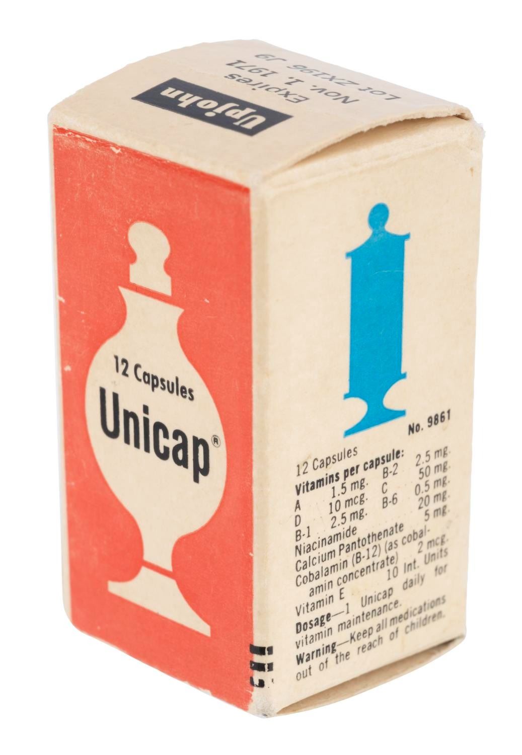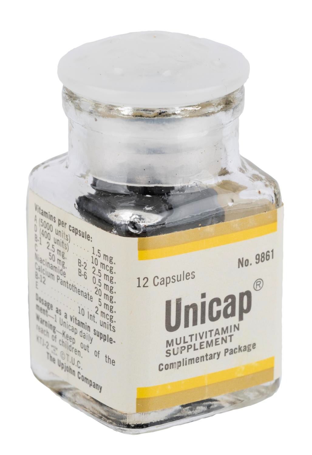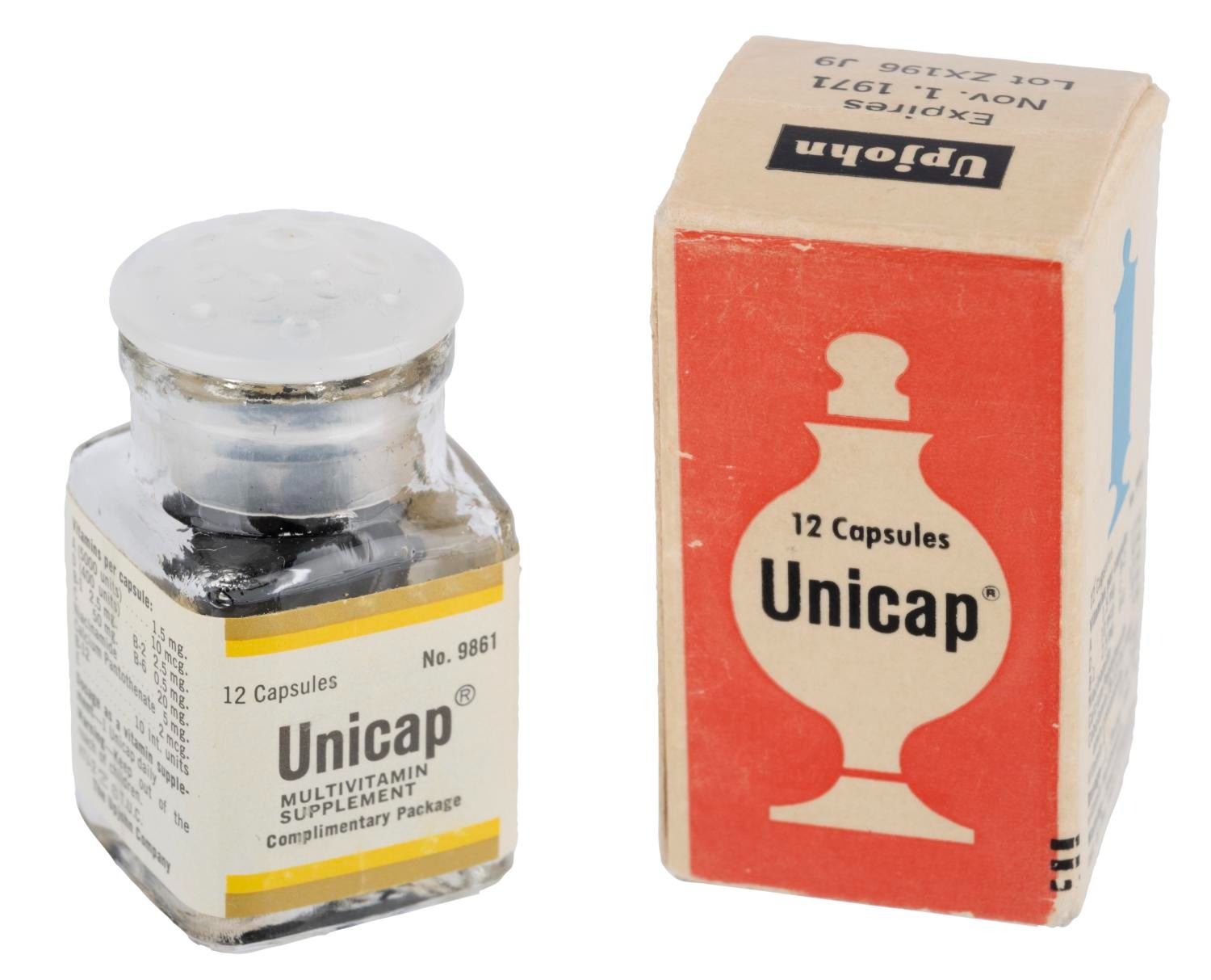 (Disneyland, 1960s-70s) A complimentary Unicap Multi-vitamin capsule bottle given to Guests of Upjohn Pharmacy on Main Street U.S.A. The bottle and box feature Sleeping Beauty Castle and the Upjohn logo. Measuring 1.5" and 1.75" tall, the bottle is in fine condition while the box is in good condition with creases, yellowing, and wear to the cardstock and paper elements. These pills are for collectible and display purposes only and should not be consumed due to age.