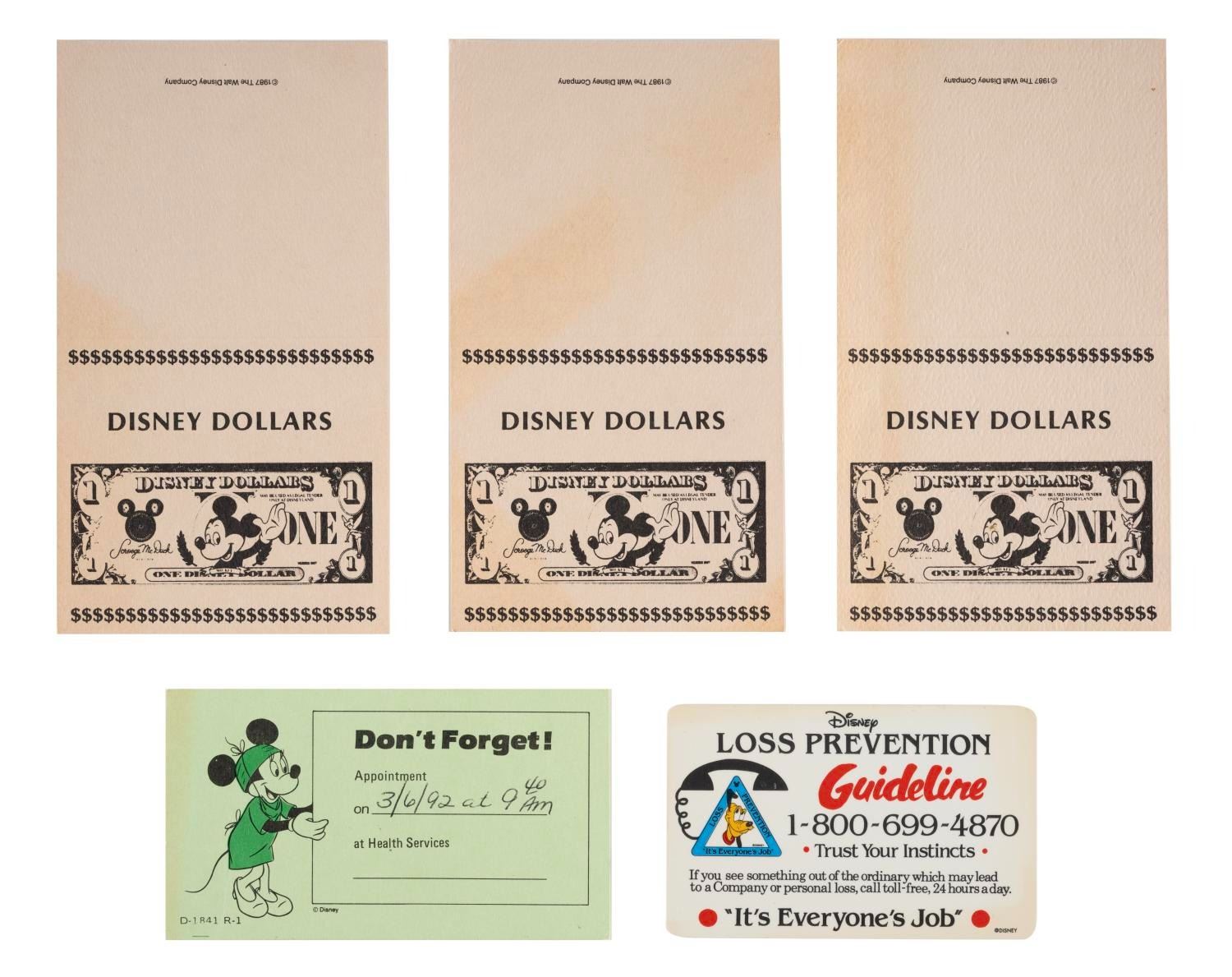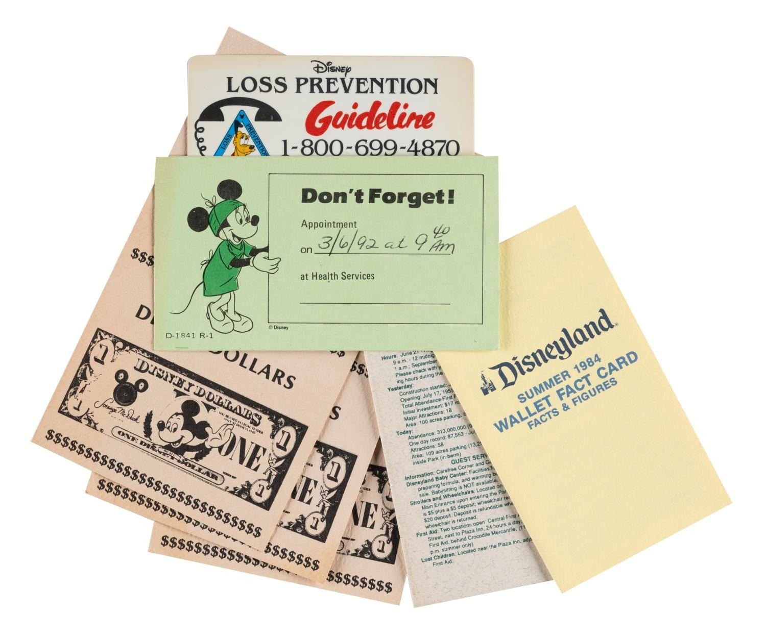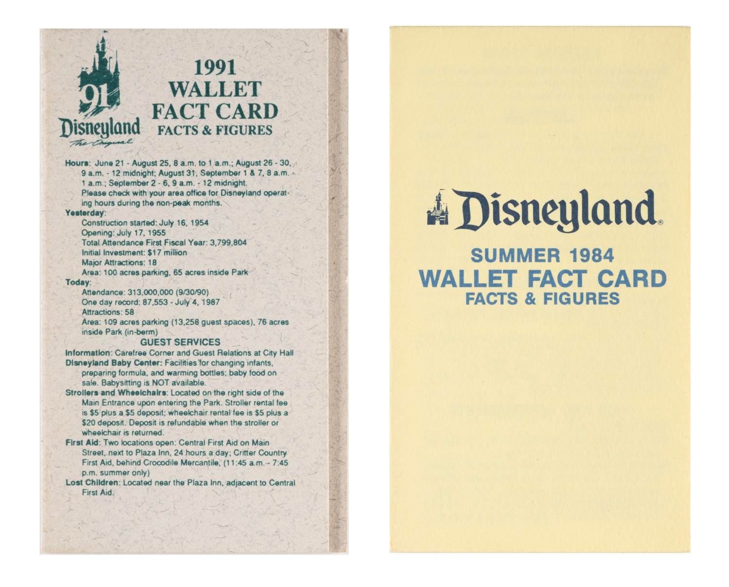 (Disneyland, 1984-92) A collection of Disneyland Wallet Fact Cards. This collection includes (2) Wallet Fact Cards, (3) Disney Dollars Key Facts Cards, a Loss Prevention Guideline Card, and a Health Services Appointment Card. Measuring between 3.5"x2.25" and 4"x11.25" (when unfolded), each piece is in very good condition with wear from handling.